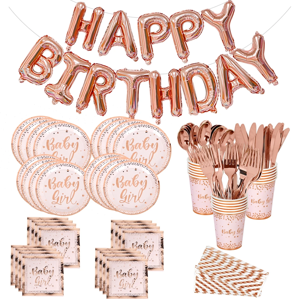 Декорации С Днем Рождения Розовое золото одноразовая посуда Бумага таблички чашки Baby Shower девочки; Дети взрослых День рождения Декор