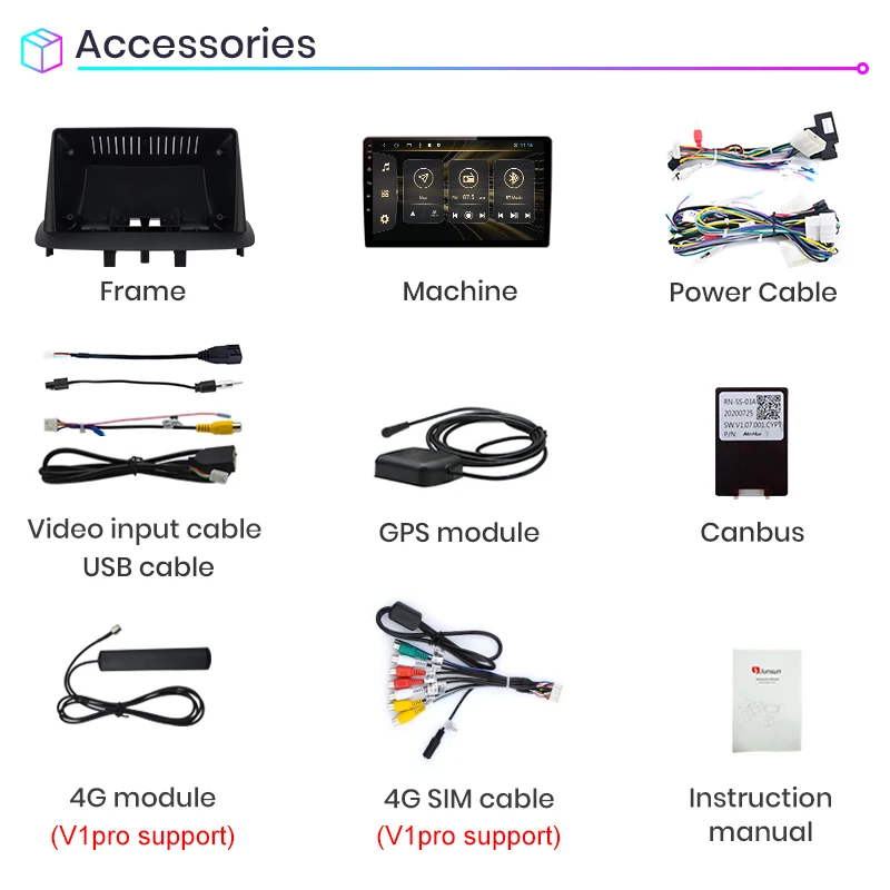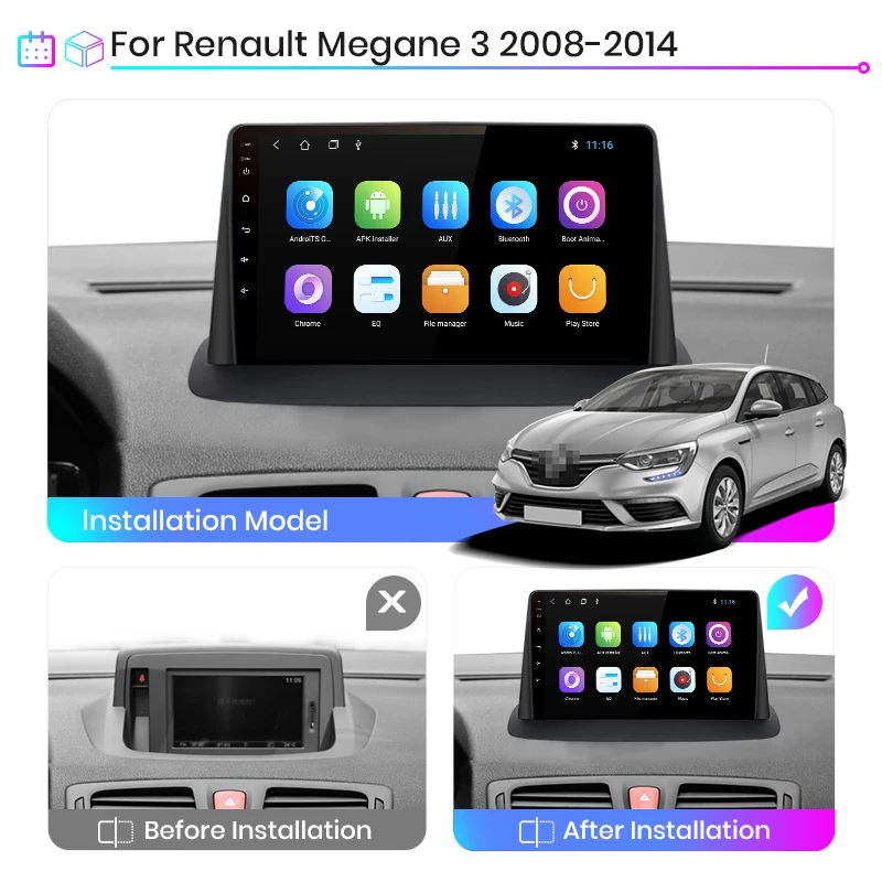 > Junsun V1 для Renault Megane 3 2008 - 2014 функции> Основные функции: Android 10,0 + 9 дюймовый IPS экран + четырехъядерный 1,2 ГГц (восемь ядер 1,8 ГГц опционально) + DDR3 1 ГБ флэш (2 ГБ/4 ГБ/6 Гб опционально) + 16 Гб памяти (32 ГБ/64 Гб/128 Гб опционально) + WIFI (сеть 4G опционально) + зеркальная связь + управление рулевым колесом + RDS/DSP (опционально)> Специальные функции:1. PIN-PIN:Junsun радиокабель питания-pin, прост в установке;2. Встроенный Carplay/ Android Auto: Поддержка версии V1/V1Pro, просто используйте кабель телефона, подключите его, стабильный и простой в использовании;3. Поддержка подголовника: только поддержка версии Junsun V1;Дополнительные аксессуары> Голосовое управление AI: Просто скажите слово команды Управляйте радио без рук, сделайте диск более безопасным> ADAS DVR камера, мониторинг давления в шинах, OBD2, внешний микрофон, RCA кабель;