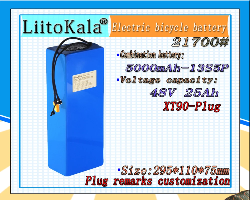 Литиевый аккумулятор LiitoKala, 48 В, 25 Ач, 21700, 5000 мАч, 13S5P, 48 В, 25 Ач, 1000 Вт, батарея для электрического велосипеда со встроенным разъемом 20A BMS T XT90