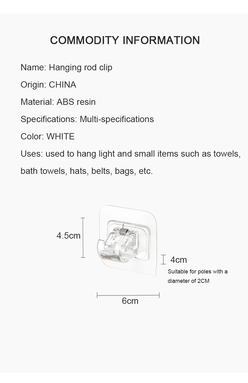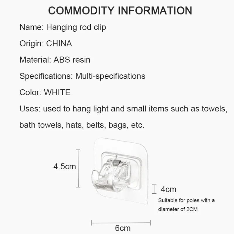 Особенности:100% новый товар высокого качества.Очень креативный продукт, очень практичныйВы можете завязать столб на передних и задних концах, чтобы вы могли использовать его в качестве подвесного стержня, вы можете повесить полотенце и т. д. Характеристики:Название: зажим для подвесного стержняПроисхождение: КитайМатериал: АБС-пластикХарактеристики: подходит для полюсов диаметром 2 смЦвет: белый, прозрачныйИспользование: используется для подвешивания светильник и небольших предметов, таких как полотенца, банные полотенца, шляпы, ремни, сумки и т. Д. Посылка включает в себя:2 шт. * фиксатор или 4 шт. * s-образный крючок