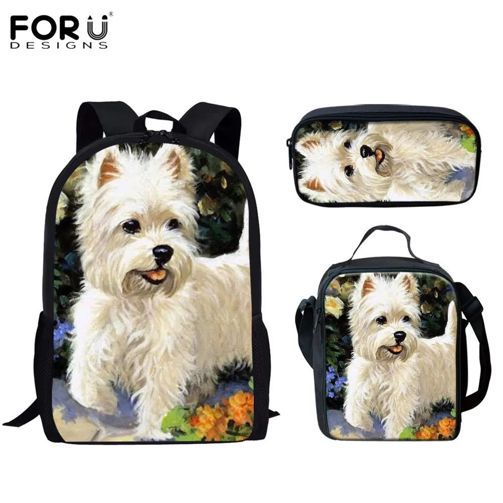 Рюкзак для мальчиков и девочек FORUDESIGNS, школьный комплект из 3 предметов, с принтом в виде белой собаки Вест-терьера