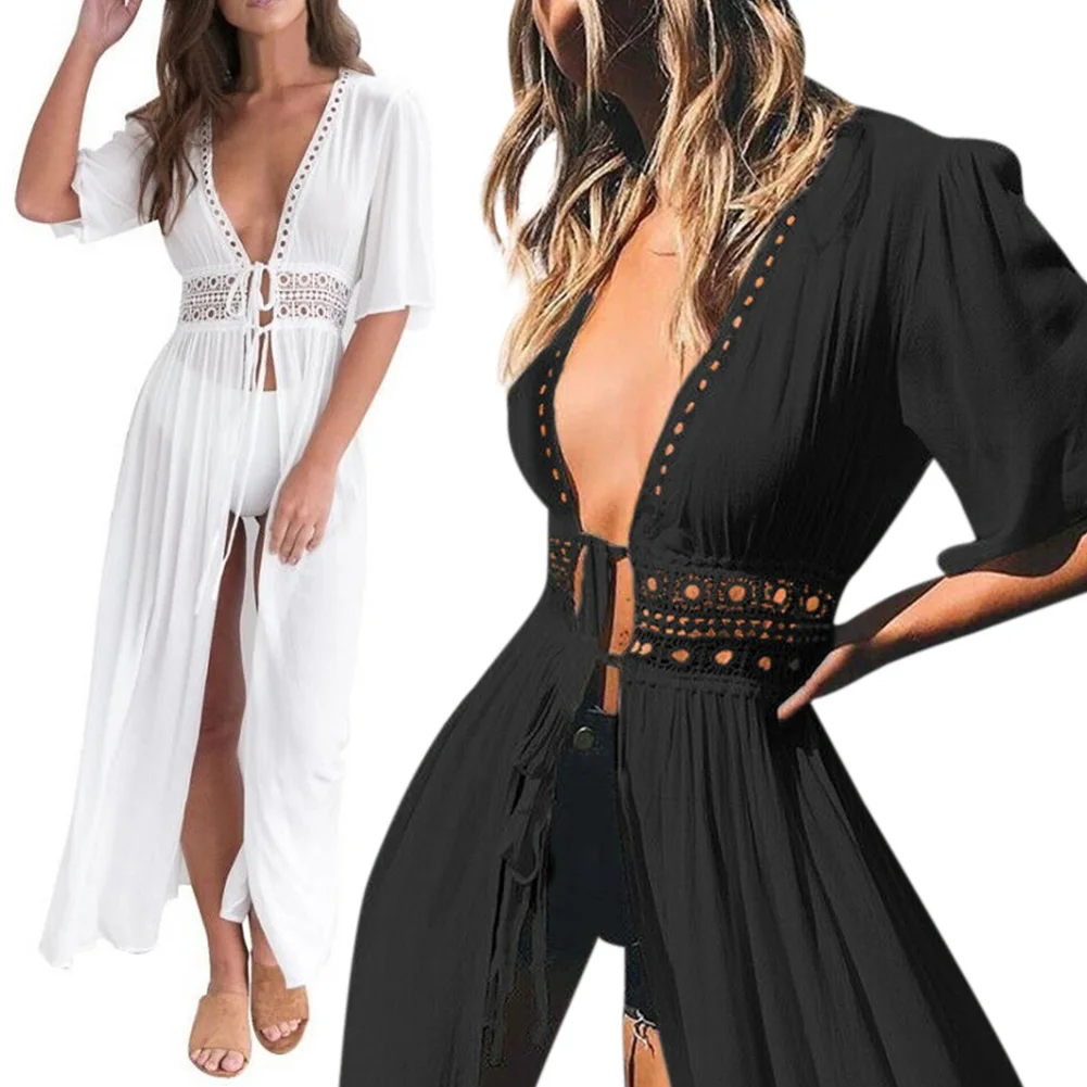 Сексуальное женское пляжное накидка бикини на шнуровке, длинное платье, халат, купальник, шифоновый Свободный кардиган, летняя пляжная одежда для отдыха