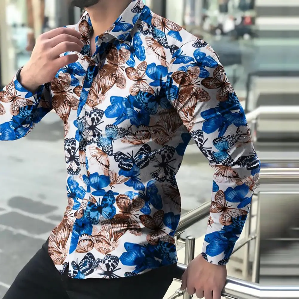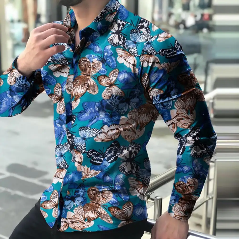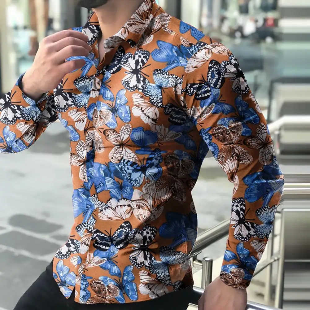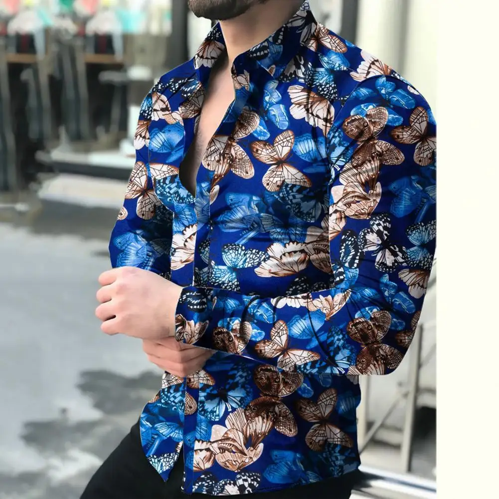 Мужская рубашка 2021 Винтаж полиэстер летняя рубашка с принтом бабочками кнопки для мужчин с длинным рукавом топ с отворотом Повседневная рубашка блуза Вечерние