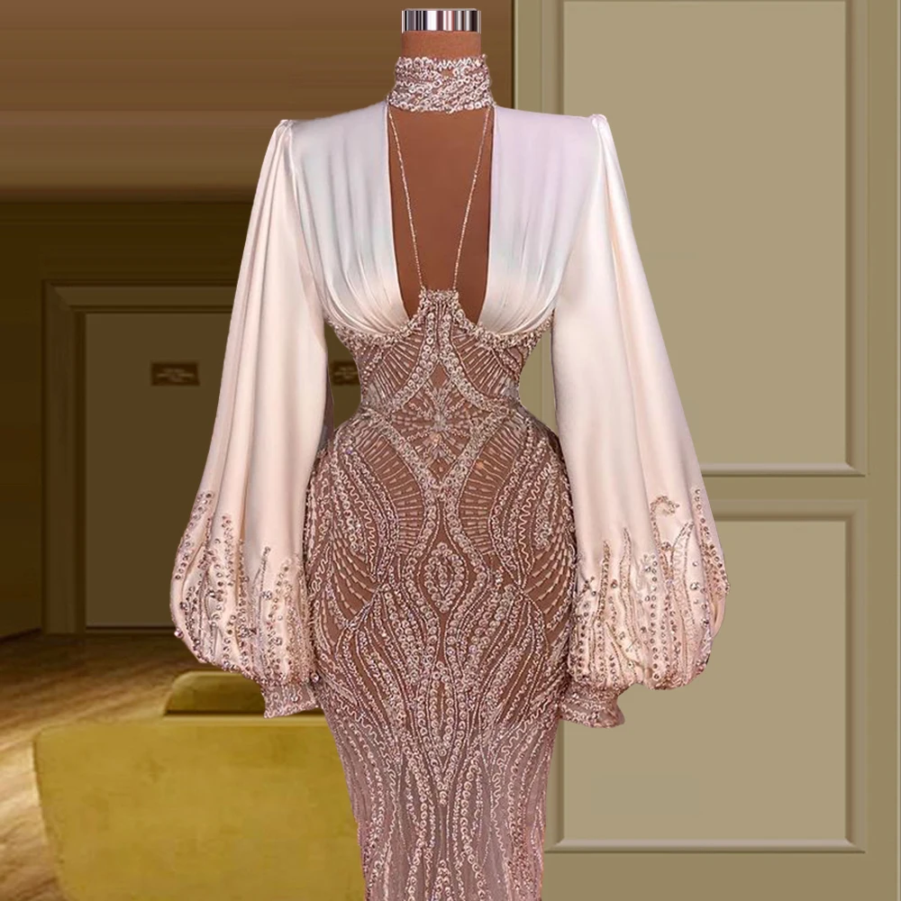 Женское вечернее платье с высоким воротником и рукавами-фонариками, длинное вечерние с бисером и кристаллами для выпускного вечера, 2021