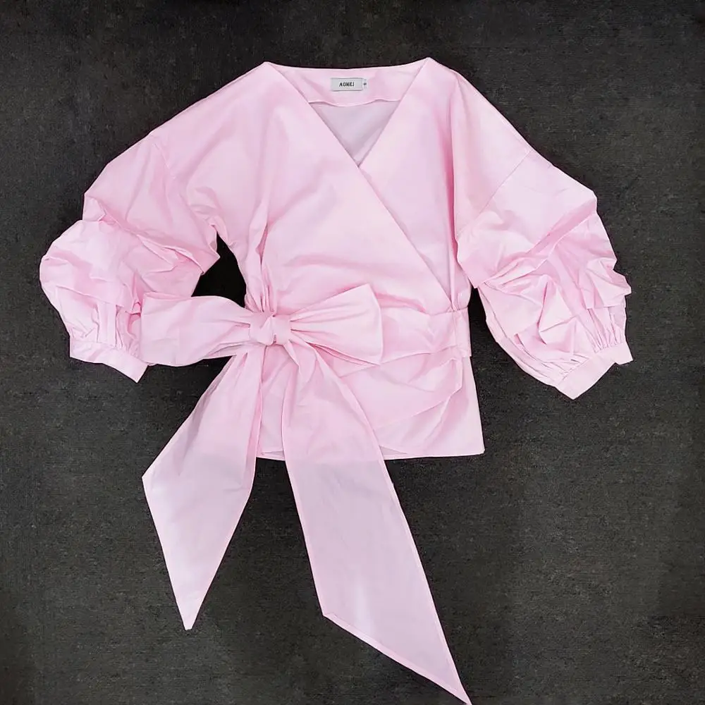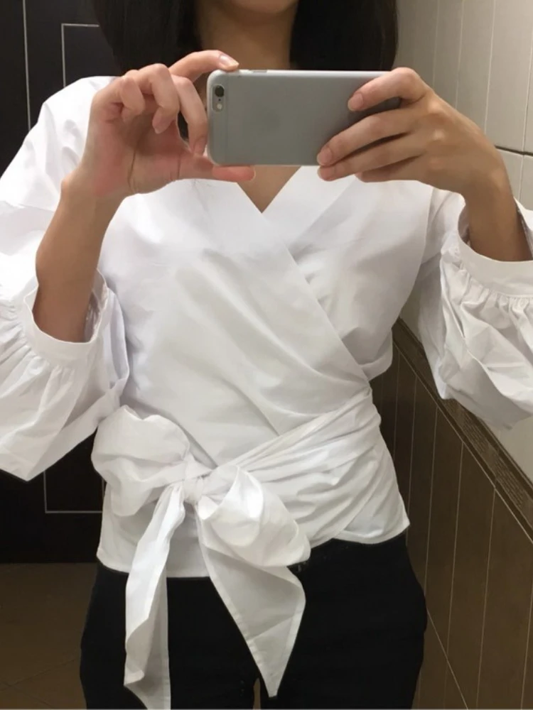 Блузка женская с поясом и бантом спереди, белый топ с пышными рукав...
