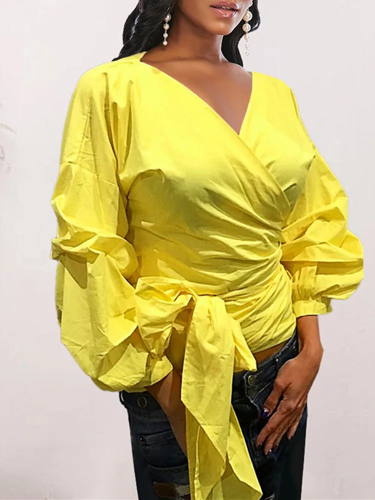 Женская блузка с поясом, повседневная желтая блузка с V-образным вы...