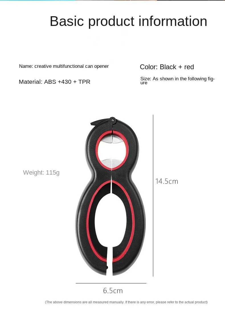 Описание товара:1. Изготовлен из прочной нержавеющей стали и нетоксичного АБС-материала;2. Многоцелевое использование: завинчивающаяся крышка/разрывная бутылка бумаги/банка с винтом/консервы/разрезанный пакет/открытое пиво3. Многофункциональный консервный нож, с помощью которого можно открывать крышки различных размеров, банки, порванные пакеты и т. д., практичные кухонные приспособления