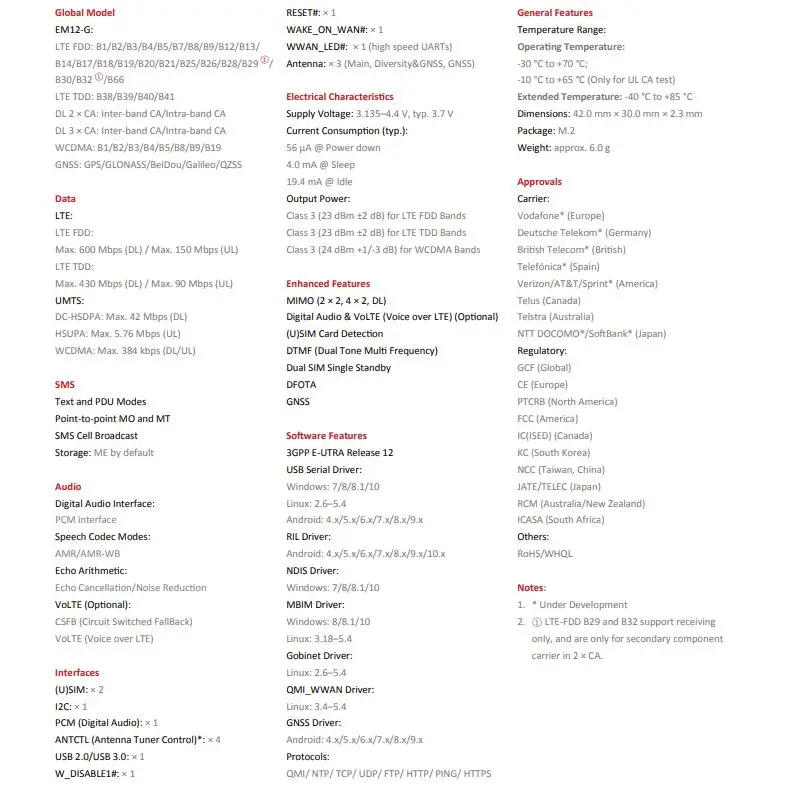 EM12-G-это модуль категории 12 LTE, оптимизированный специально для приложений M2M и IoT. Принятие спецификации 3GPP Release 12, которая обеспечивает пиковую скорость передачи данных 600 Мбит/с и 150 Мбит/с uplink. Разработанный в форм-факторе M.2, EM12-G совместим с модулем EM06 категории 6 Quectel и будущим модулем EM16 категории 16, чтобы включить переход между различными категориями. EM12-G разработан для глобальных и почти охватывает все основные транспортные средства по всему миру.