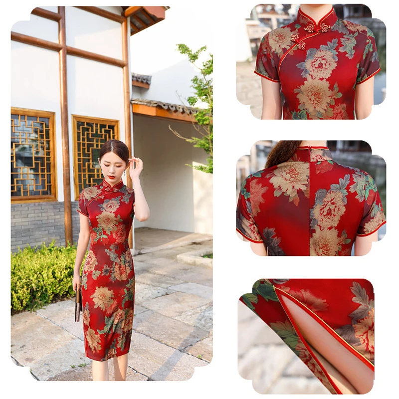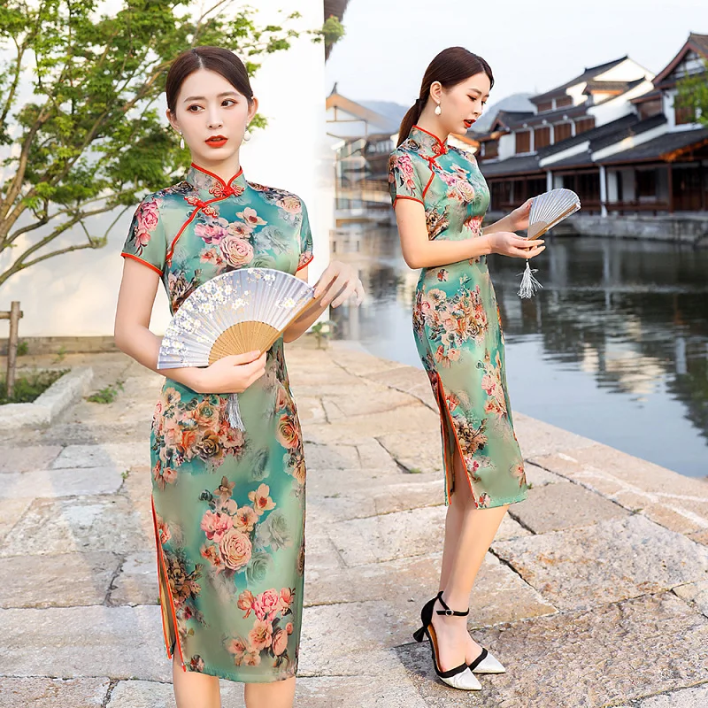 Женское китайское платье с разноцветным цветочным принтом, летнее китайское платье-Ципао с пуговицами ручной работы 3XL4XL, 2022