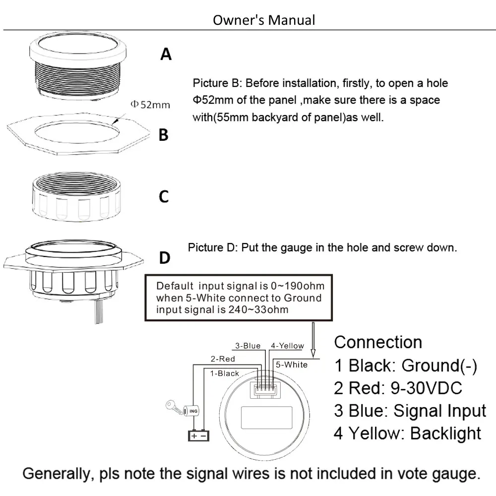 -Диаметр установки: Φ85 мм или 3-3/8"-Диапазон индикации: порт ~ STBD-Входной сигнал: 0 ~ 190 Ом-Рабочее напряжение: 9 ~ 32 В постоянного тока-Степень защиты: IP67-Цвет изделия: черный, белый