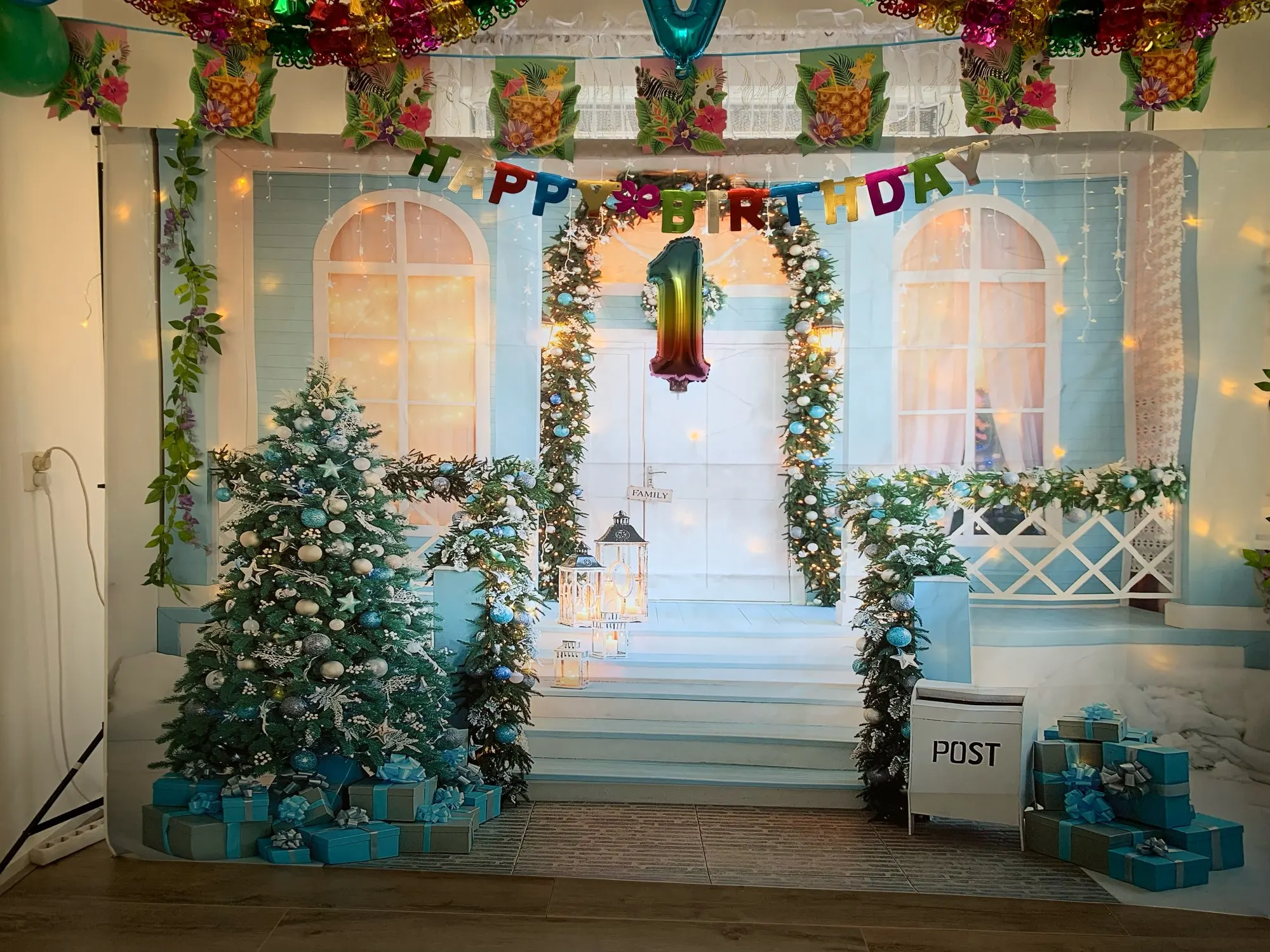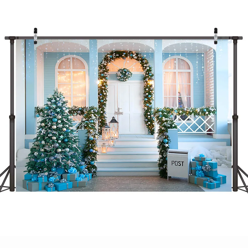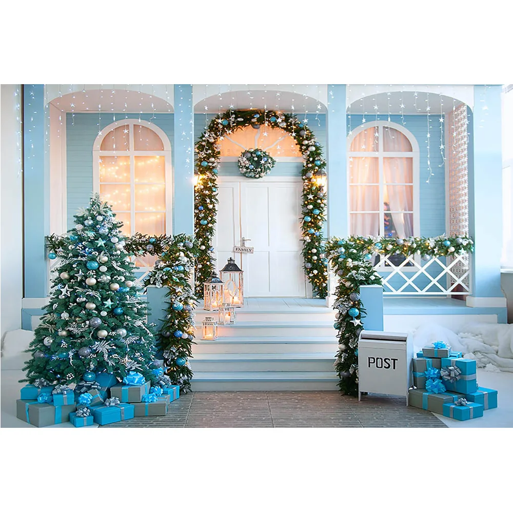 Рождественский фон для вечерние украшения синий ретро дом зимняя портретная фотография Фон Рождественская елка подарки венок