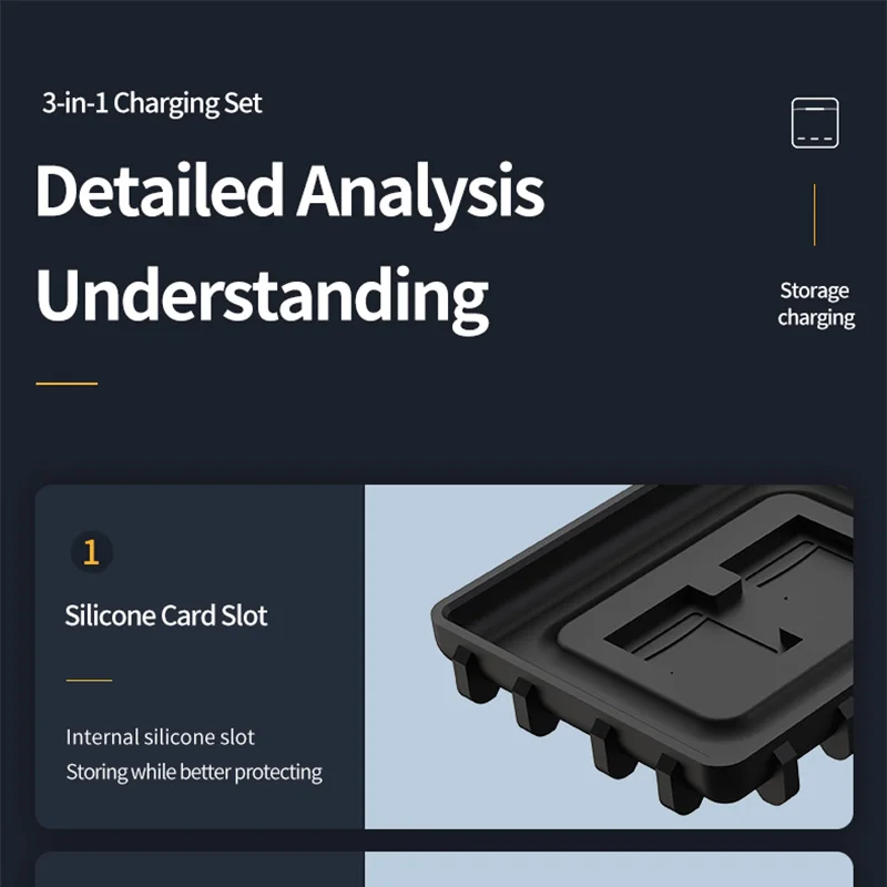 -Приятная для кожи текстура, олеофобное покрытие-Можно хранить две карты памяти одновременно-Маленький размер, легко помещается в рюкзак-Быстрая зарядка, 2,5 H полной зарядки-Можно заряжать три аккумулятора одновременно, останавливаться при полном заряде