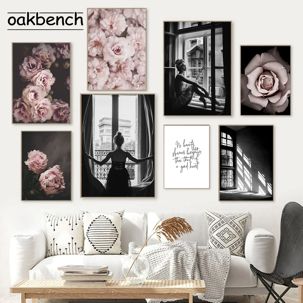 Картина на холсте розовая роза, настенный плакат с цветами, черно-белые картины на стену балерины, скандинавские Плакаты для украшения комнаты для девочек