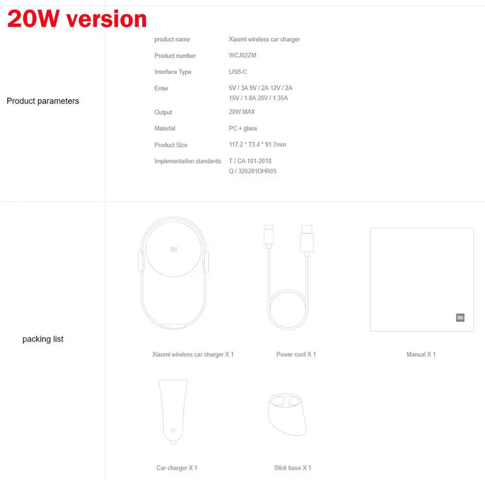 Характеристики: Название продукта: беспроводное автомобильное зарядное устройство Xiaomi Модель: WCJ02ZM Тип интерфейса: USB-C Вход: 5 В/3 А 9 В/2 а 12 В/2 А