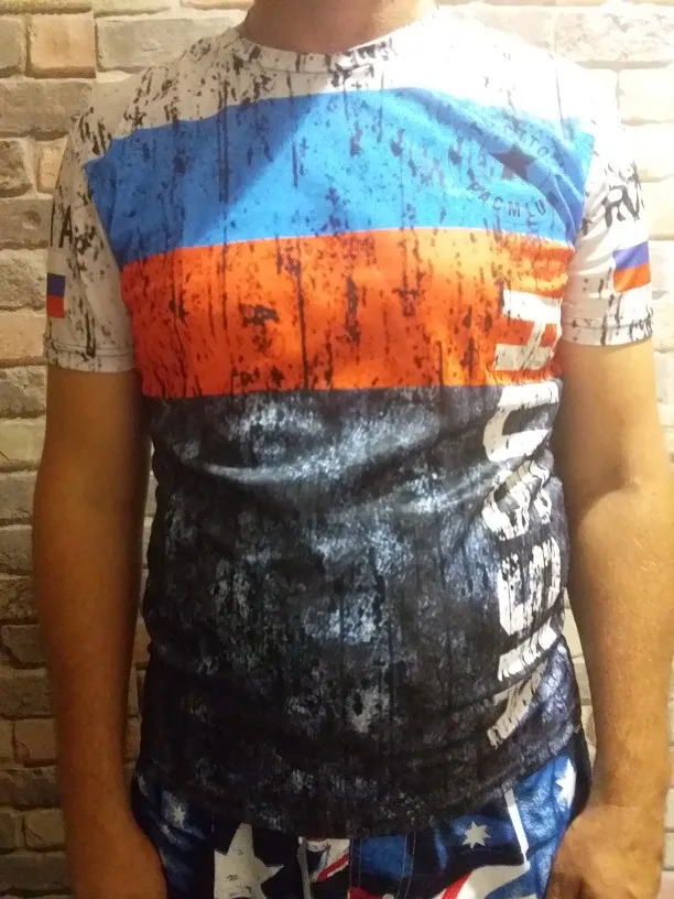 Футболка из обычной тонкой 100% синтетической ткани. Заказали xl на 54 рус., впритык в обтяжку по фигуре, как и хотел мой парень.