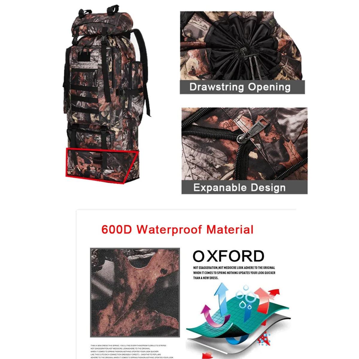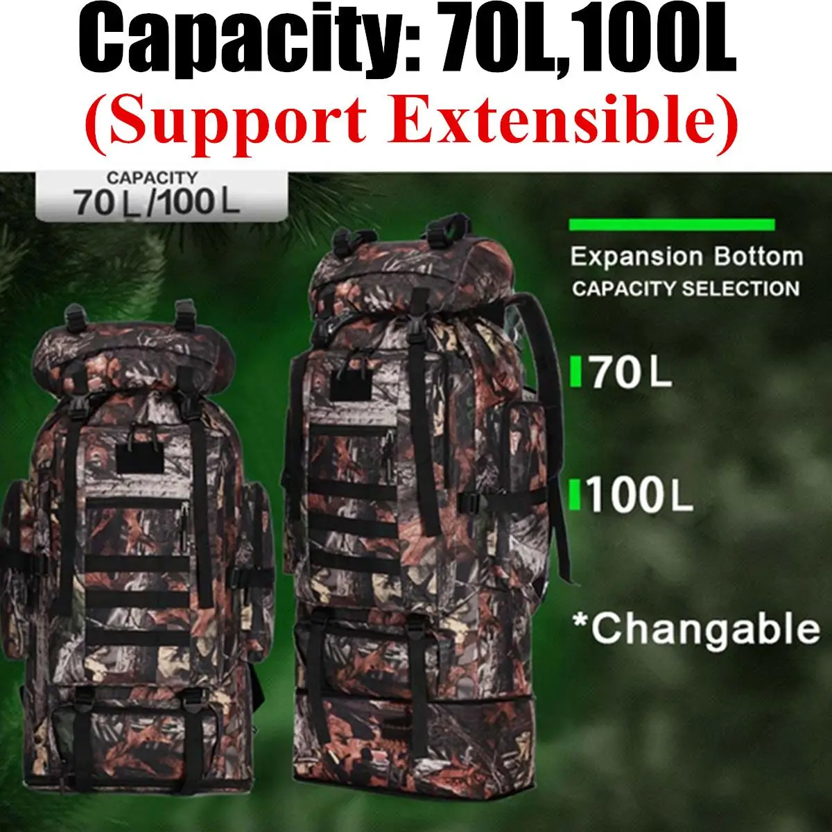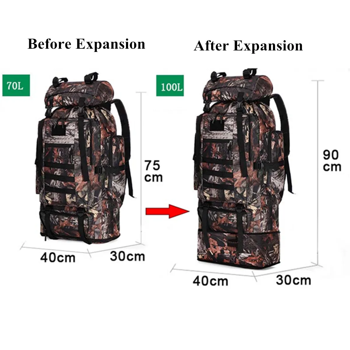 Спецификация:Цвета: черный, серый, коричневый, зеленый, камуфляжМатериал: 600D ткань Оксфорд + полиэстерЕмкость: 70 л, 100 л (расширение)70 л (перед расширением) Размер: 40*30*75 смРазмер 100 л (после расширения):40*30*90 см[Перевод единиц измерения: 1 см = 0,3937 дюйма, 1 дюйм = 2,54 см]Применимые случаи: альпинизм, туризм, кемпинг, приключения и т. д.Емкость: 70 л, 100 л, может быть расширена, усадка, более удобное хранение.