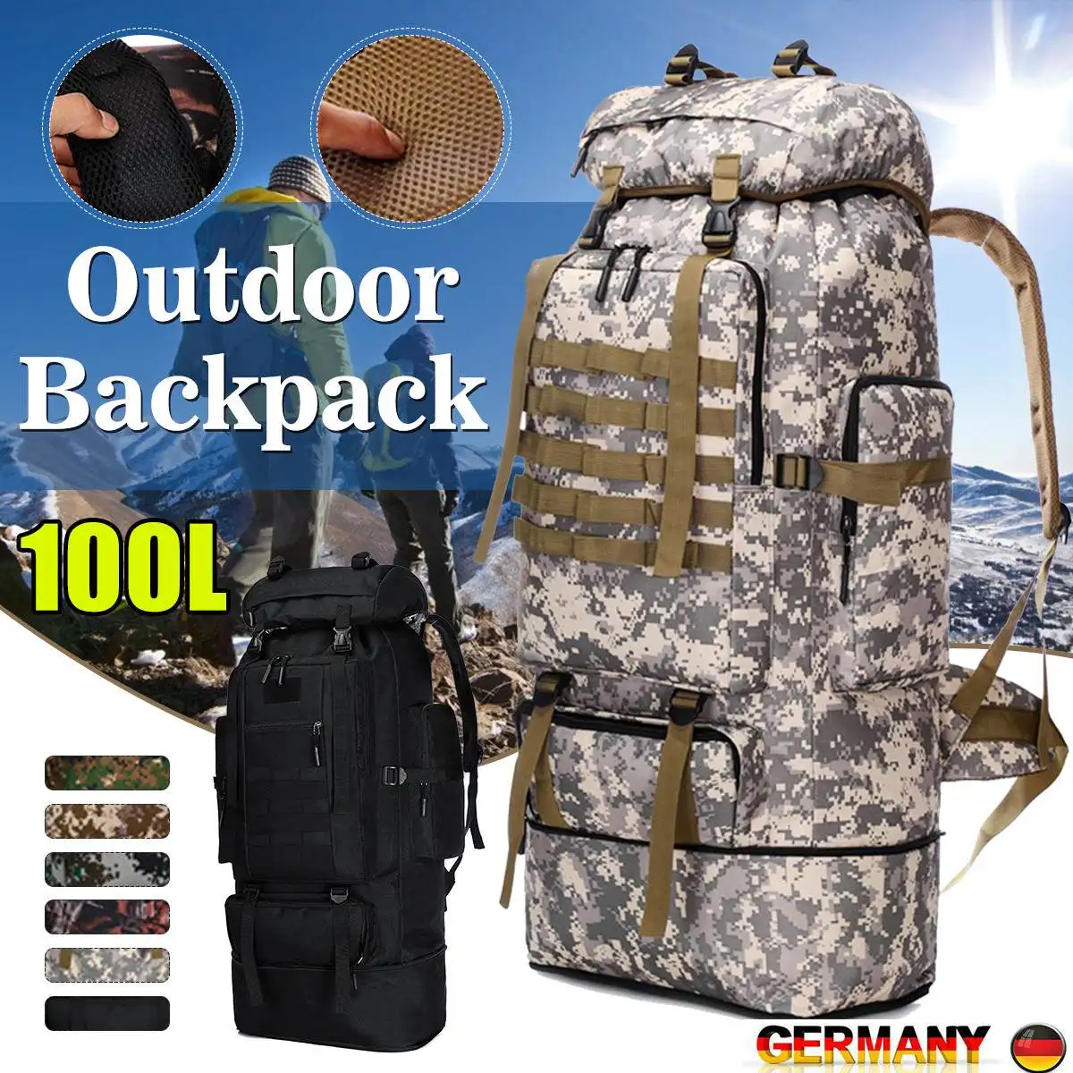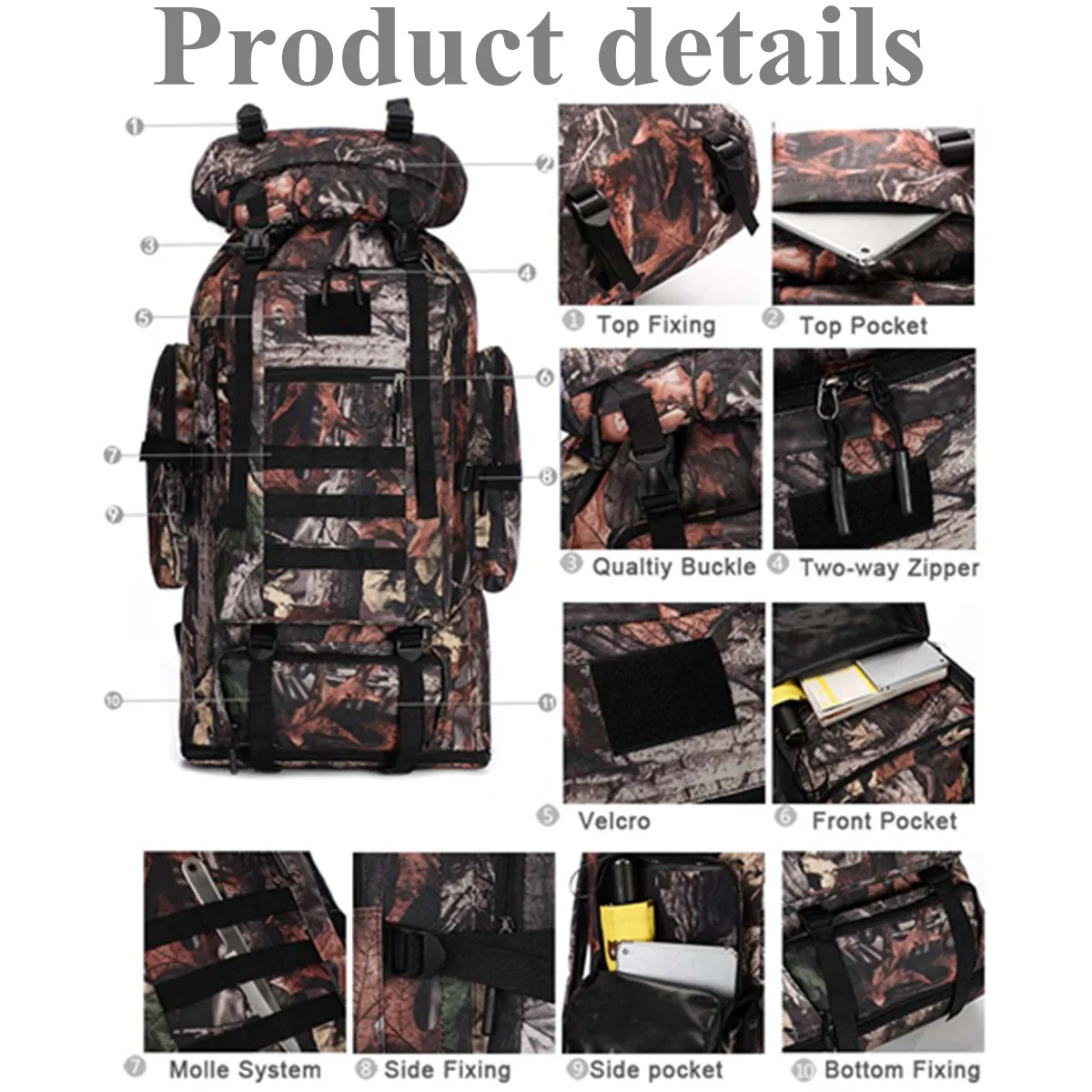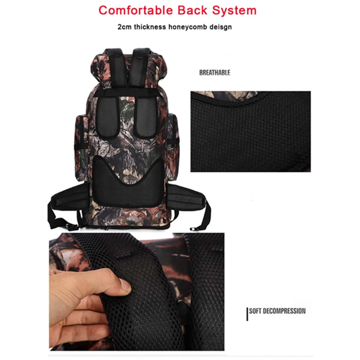 Спецификация:Цвета: черный, серый, коричневый, зеленый, камуфляжМатериал: 600D ткань Оксфорд + полиэстерЕмкость: 70 л, 100 л (расширение)70 л (перед расширением) Размер: 40*30*75 смРазмер 100 л (после расширения):40*30*90 см[Перевод единиц измерения: 1 см = 0,3937 дюйма, 1 дюйм = 2,54 см]Применимые случаи: альпинизм, туризм, кемпинг, приключения и т. д.Емкость: 70 л, 100 л, может быть расширена, усадка, более удобное хранение.