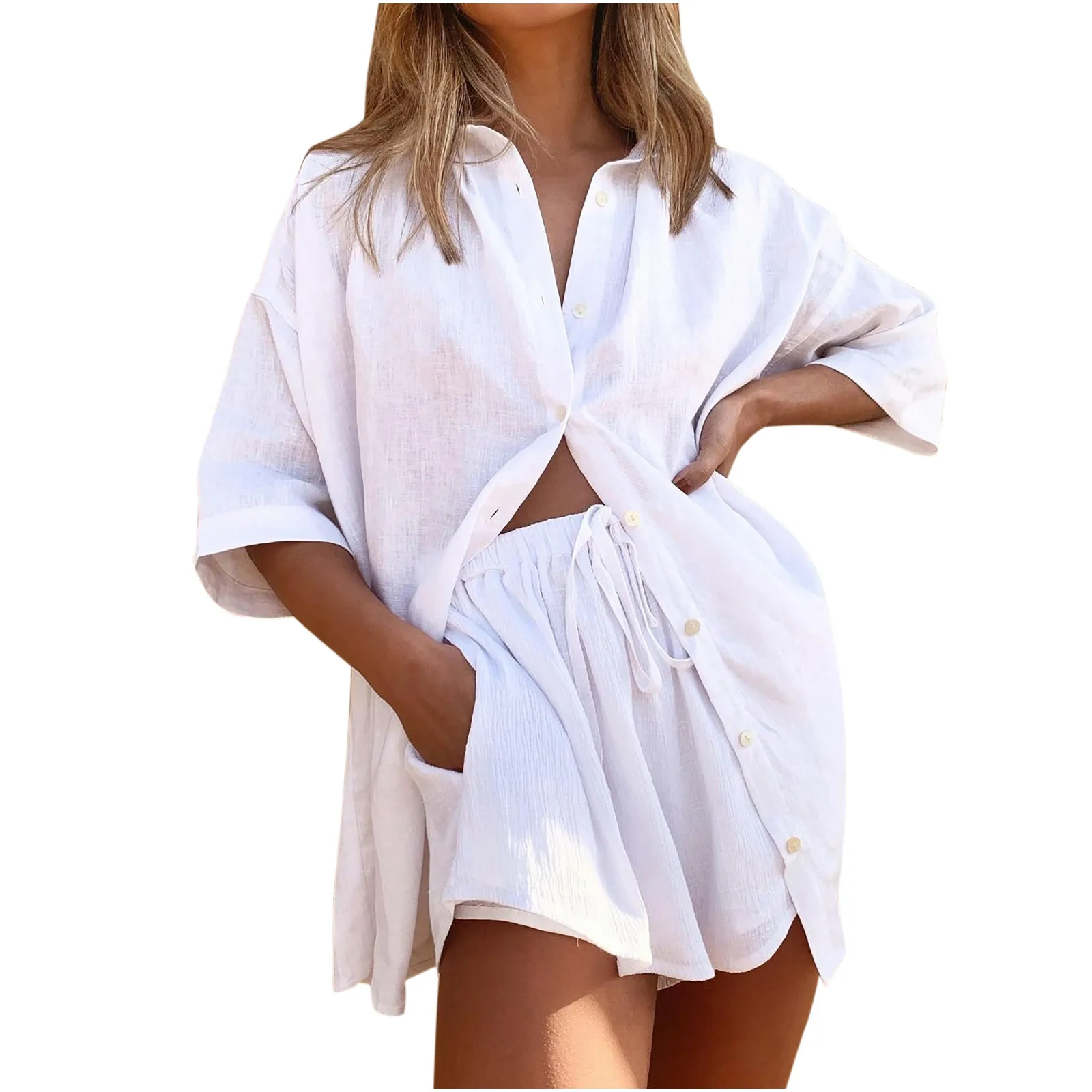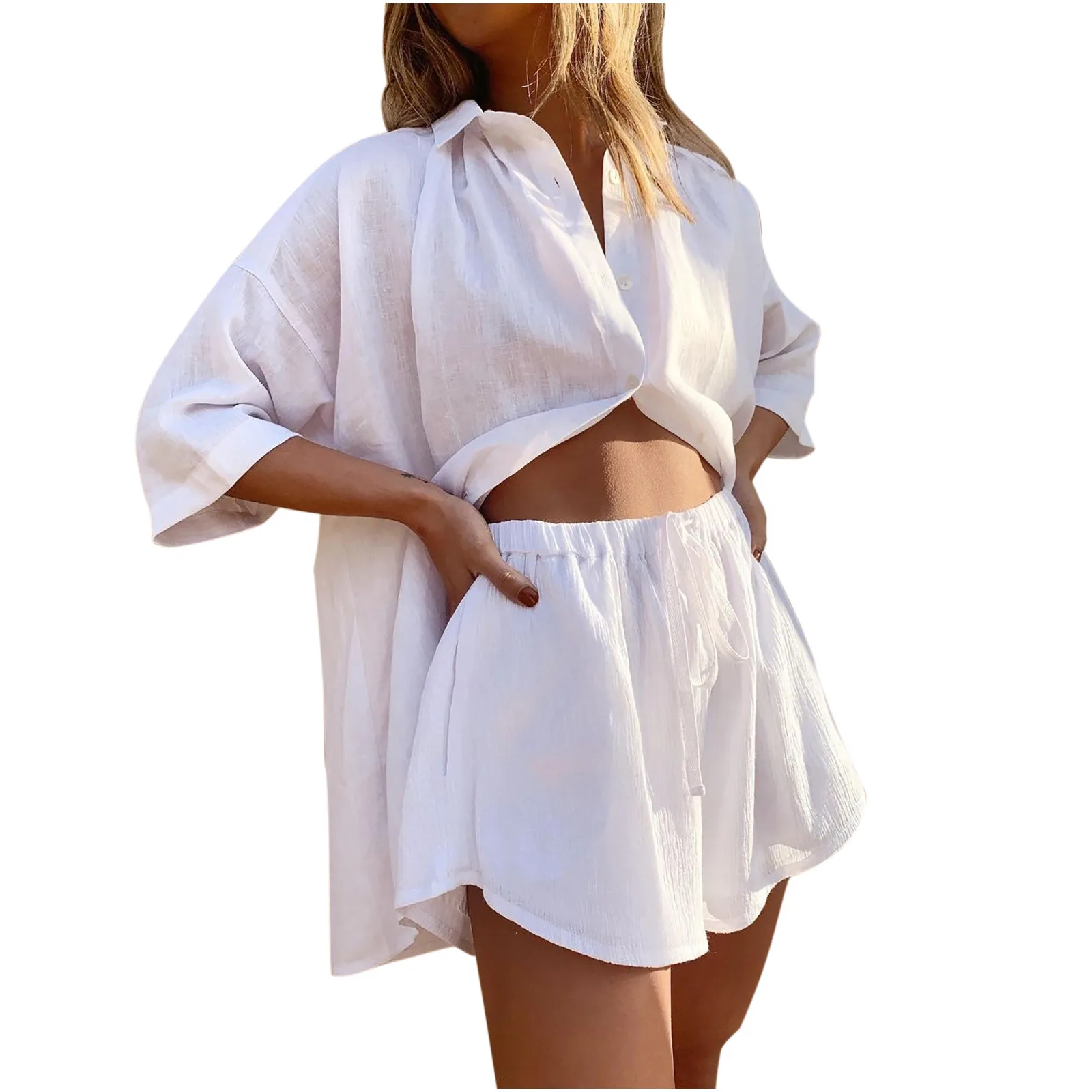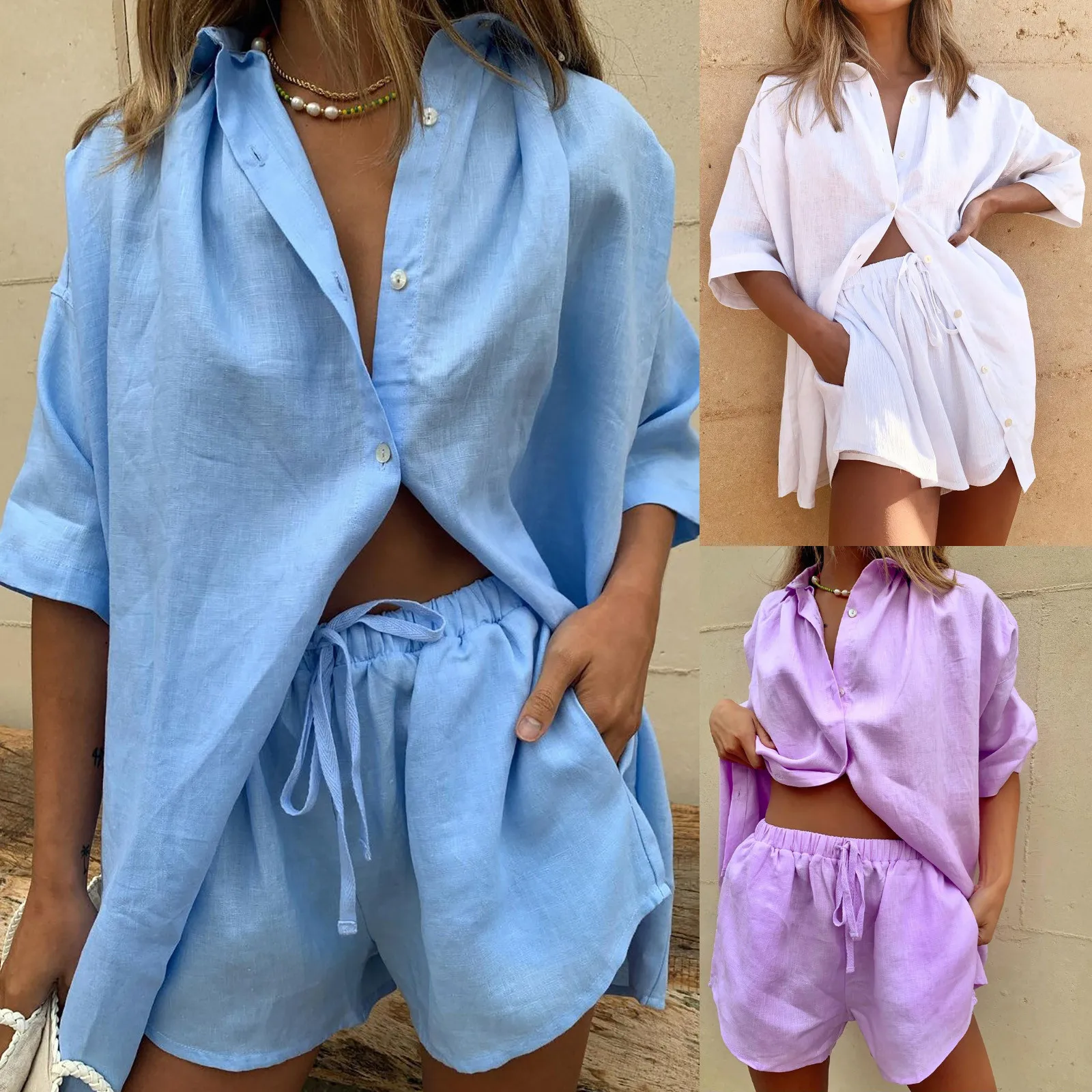 Повседневный Спортивный костюм для женщин, летний комплект из двух предметов из 2021 хлопка и льна с шортами, синяя рубашка, топы и мини-шорты свободного покроя, новая одежда для отдыха