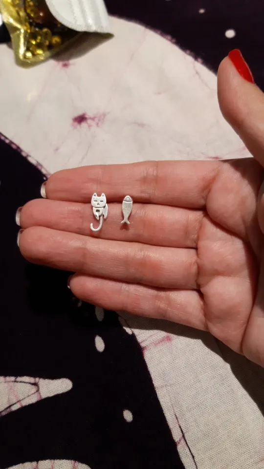 Женские асимметричные серьги-гвоздики, с изображением кота, рыбы, для девочек и детей, подарочные украшения