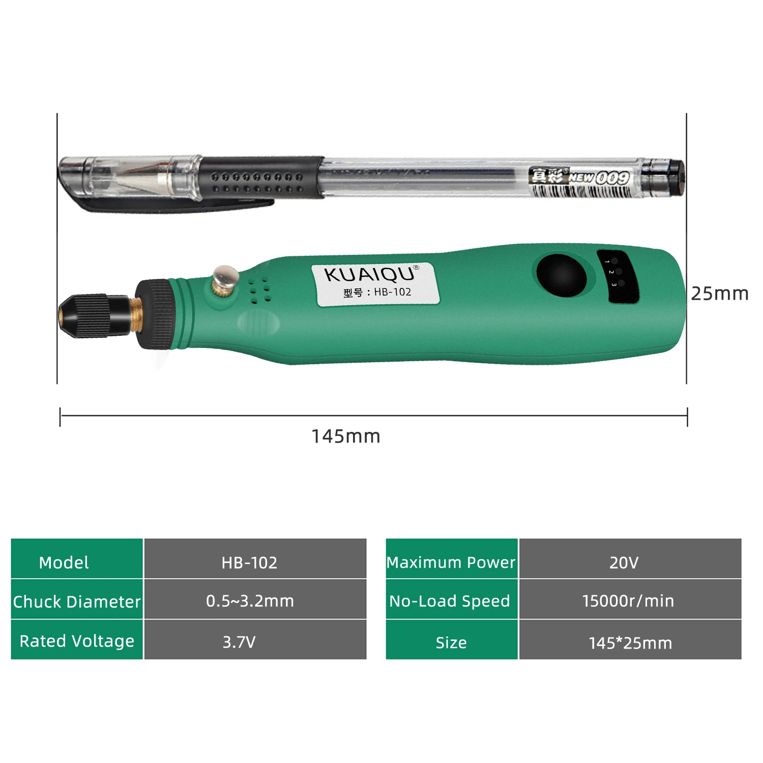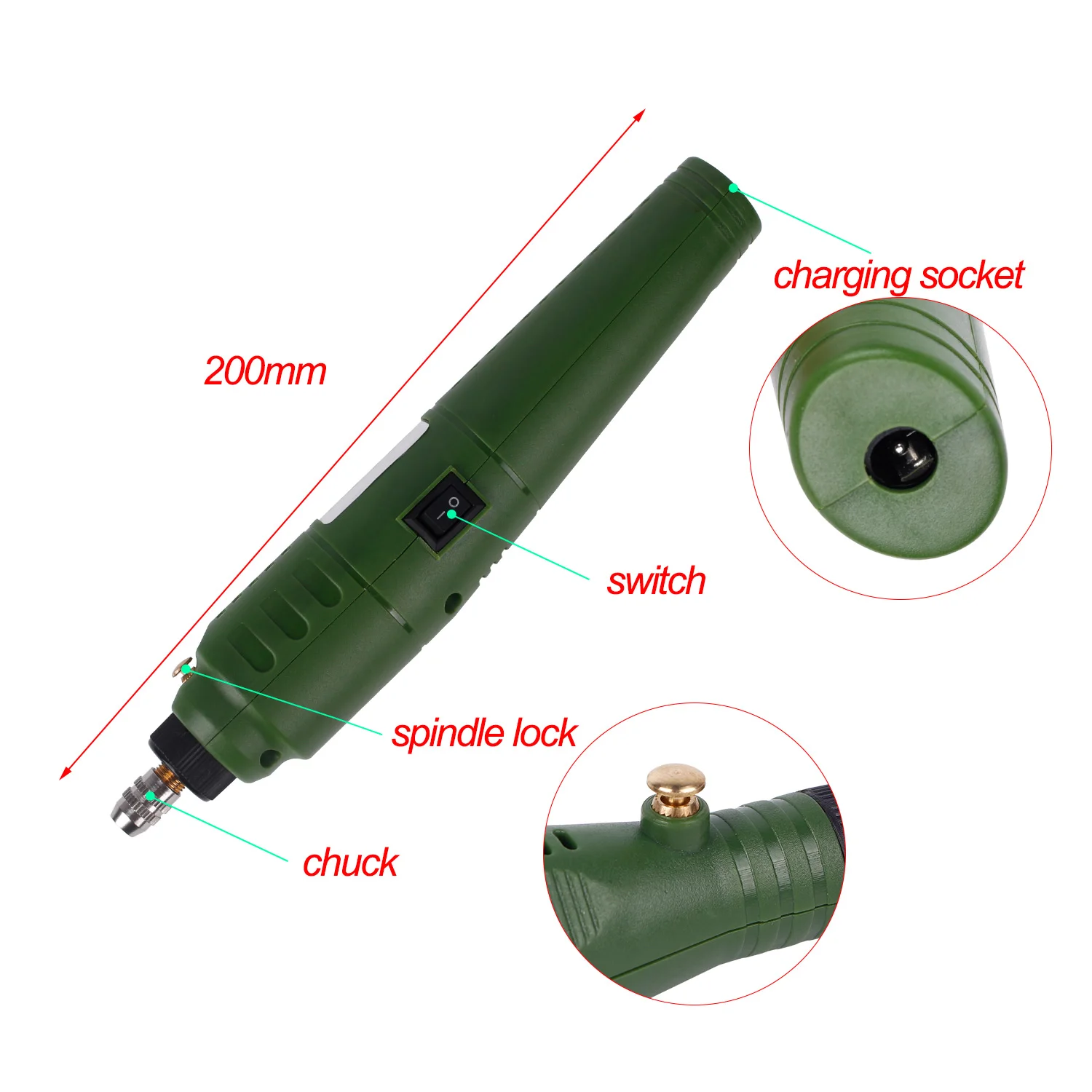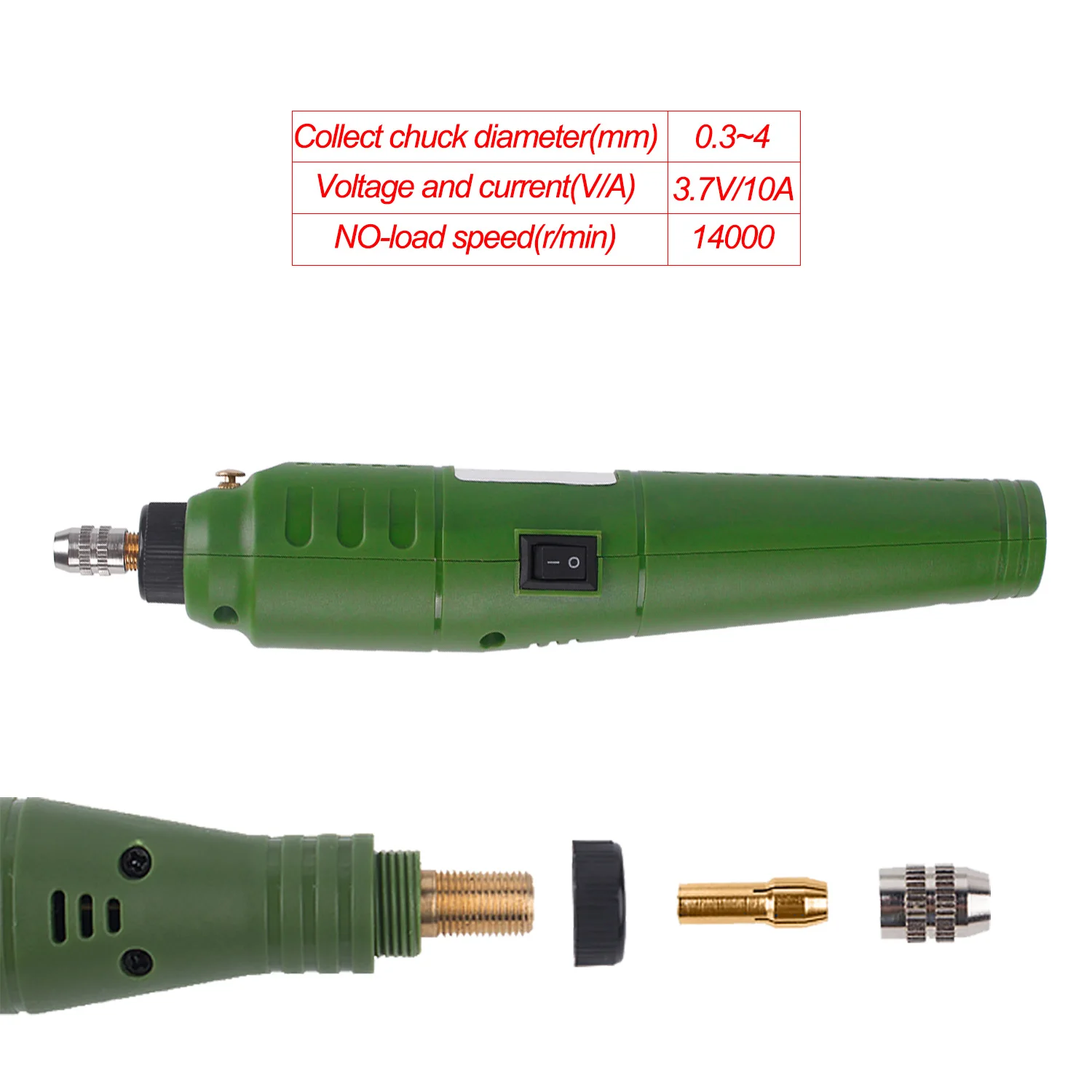Название типа: 1-speed-DrillБатарея: литиевая батареяВремя зарядки: 2 часаНапряжение зарядки: 5 В постоянного тока (USB)Диаметр патрона: 0,3-3,2 ммСкорость: 14000 об/минEngravingOutput Напряжение: 3,7 VНоминальная входная мощность: 12 ВтНоминальное напряжение: 110 В ~ 220 В