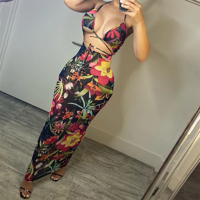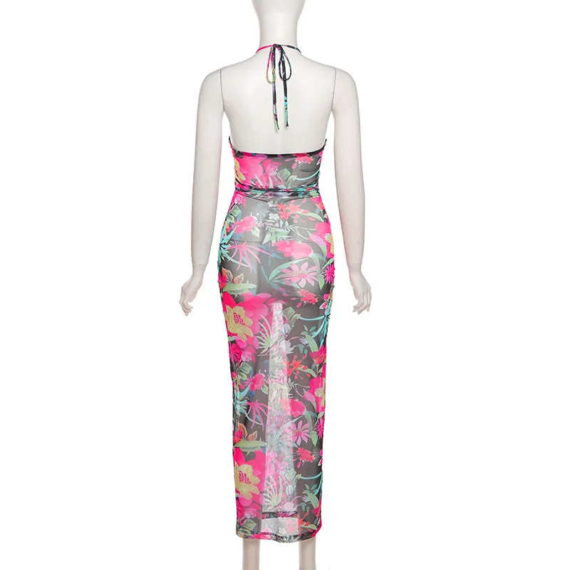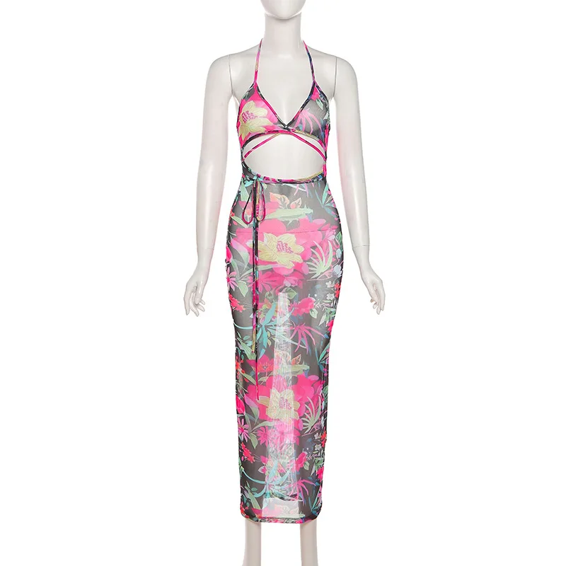 Платье без рукавов с лямкой на шее; Платье с вырезами и украшением в виде бедер; Цветочный узор; Простой и стильный.