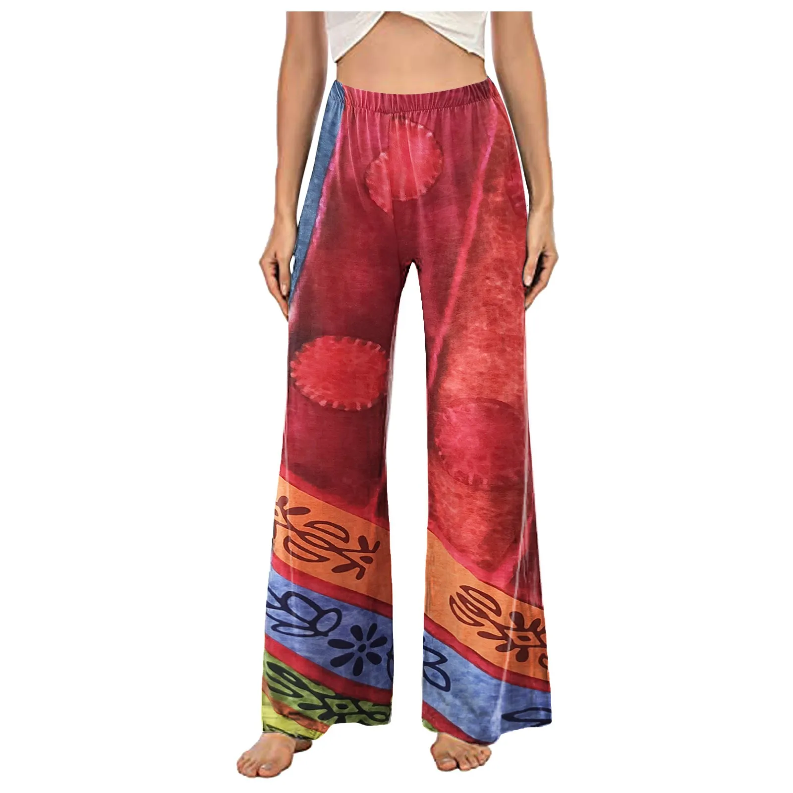 Брюки-клеш Женские с цветочным принтом, пляжные Широкие штаны в этническом стиле, свободные повседневные эластичные дышащие мягкие длинные брюки с завышенной талией, на лето