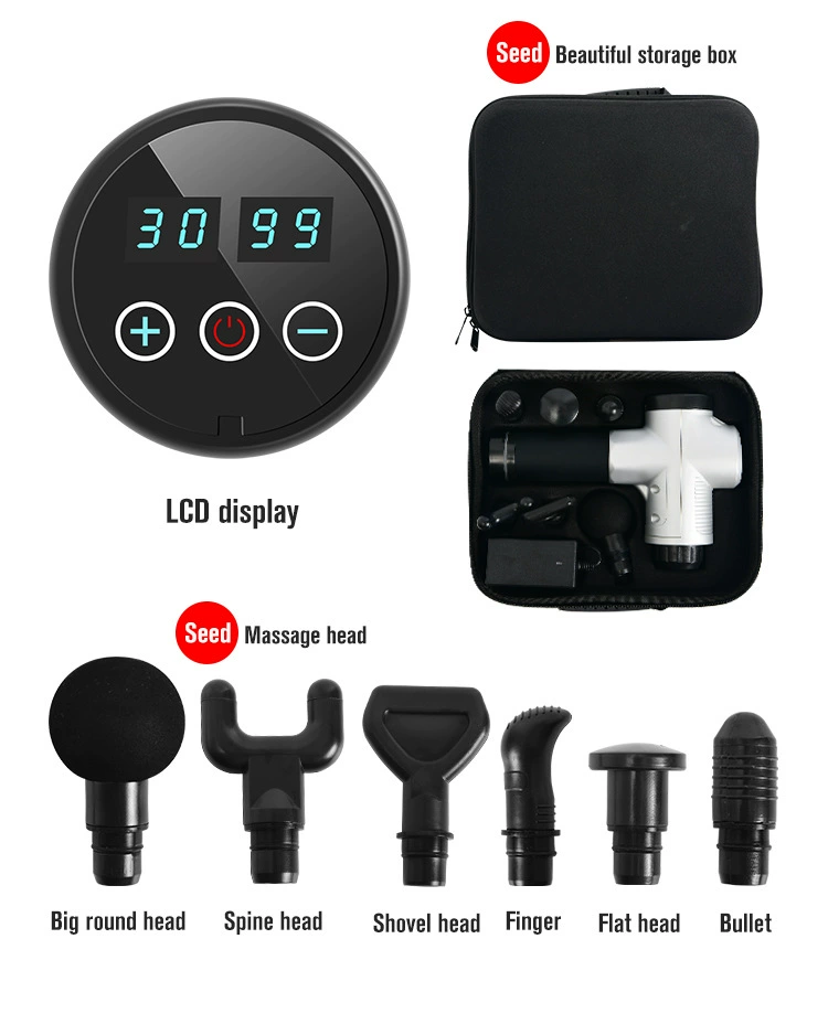 1 x массажный пистолет с ЖК-дисплеем6 массажных головокЗарядное устройство US/EU/AU/UK-1 шт.1 х Портативная сумка EVA1 x Руководство пользователя