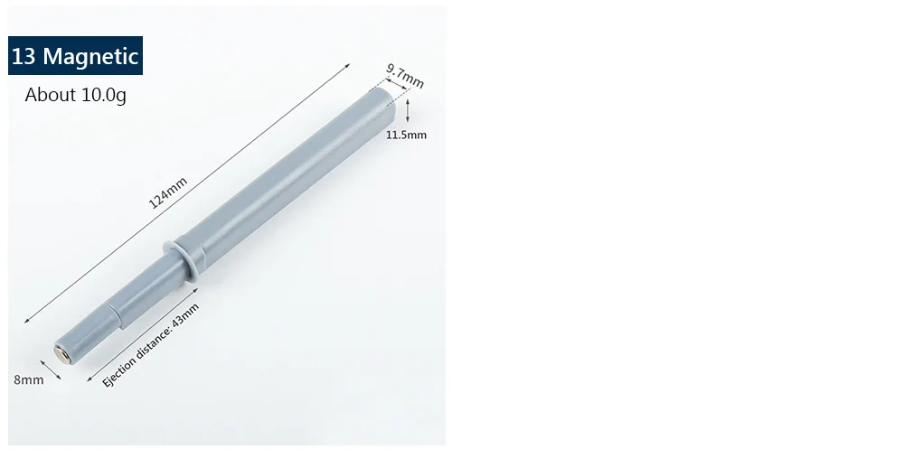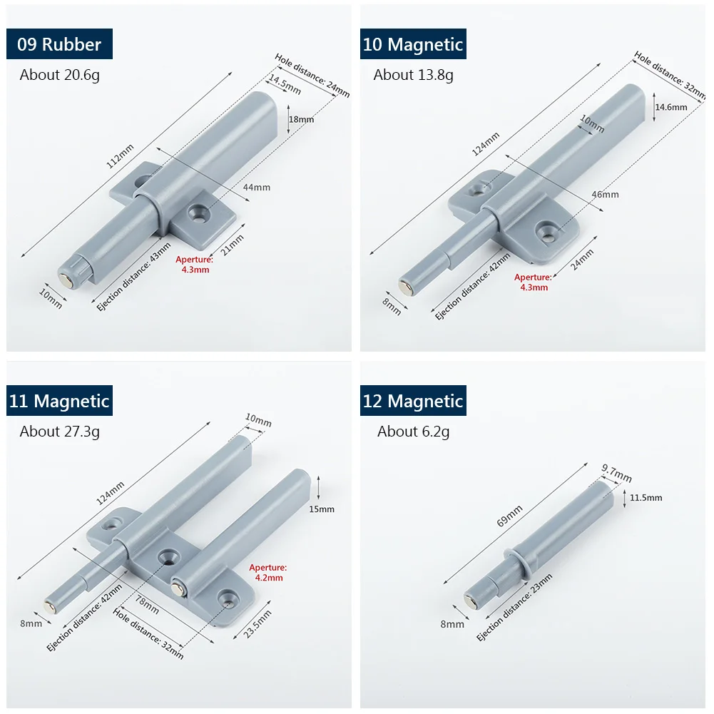 На одном конце ребаундер имеет магнитную/резиновую головку. Магнитная головка выдавливателя позволяет шкафу добиться хорошего герметичного эффекта. Резиновый наконечник буфера защищает ваши двери от захлопывания, уменьшает шум при закрытии дверей и ящиков.