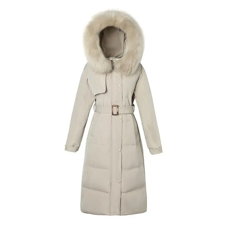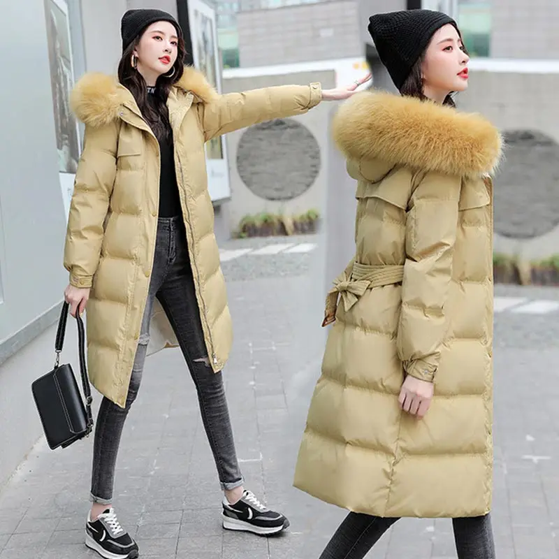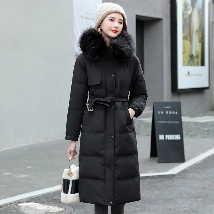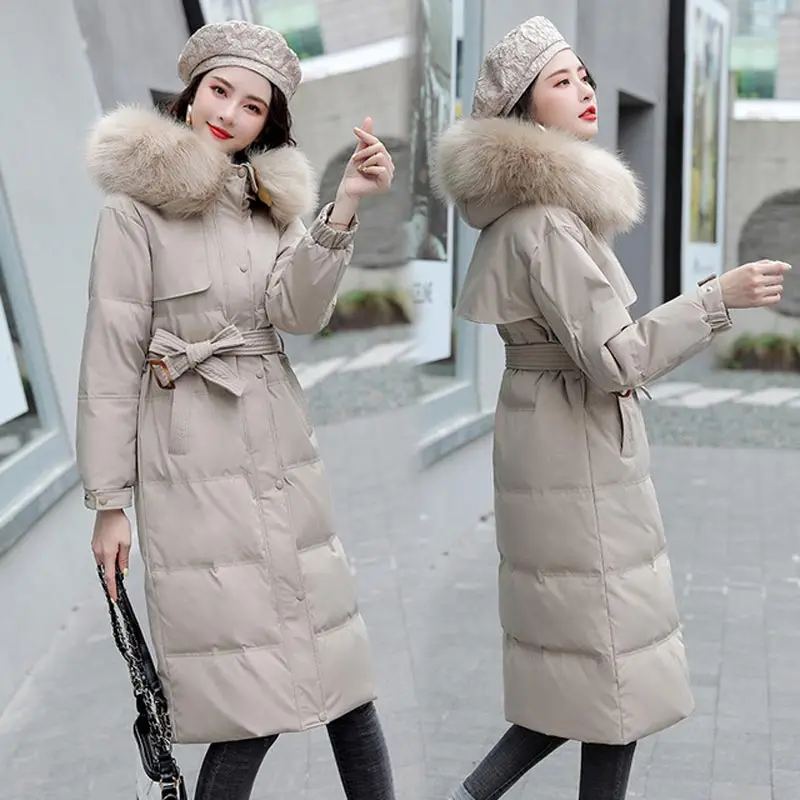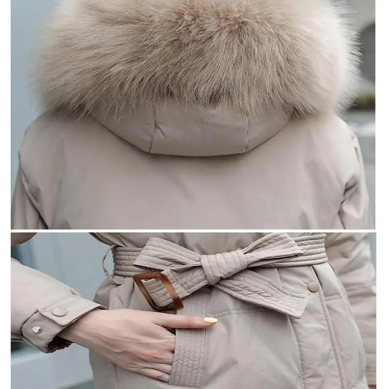 Женский пуховик 2022, элегантные Теплые повседневные куртки с поясом с капюшоном, женские парки, теплые меховые однотонные тонкие плотные пальто, женская модель