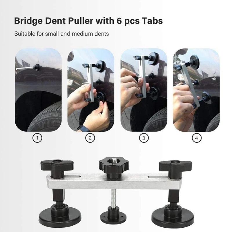 Простота в эксплуатации: dent puller kit обеспечивает подходящую платформу для тех, кто может использовать, так как аксессуары не сложны. Легко выскальзывает вмятину с подробными этапами ремонта, описанными в руководстве.Широко используется: безболезненное средство для удаления вмятин может быть применено для удаления вмятин из автомобиля, а также заломов и повреждений от града автомобиля, эффективно для вмятин в автомобиле, холодильниках, стиральных машинах, И других металлических приборов. Экономит время и деньги.Штепсельная Вилка клеевого пистолета: штепсельная вилка Европейского автомобильного зарядного устройстваРабочее напряжение: 100-240 ВТип штепсельной вилки: штепсельная вилка европейского стандарта, применяется в Индонезии, Германии, Франции, Испании, Италии и так далее.Как использовать инструменты1. Очистите поверхность от повреждений чистой влажной тканью;2. Положите клей на пистолет и подключите источник питания и нагрейте в течение 5-10 минут;3. Вытяните триггер и нанесите подходящую прокладку с экструдированным клеем (4 отверстия прокладки должны быть применены с термоплавким клеем)4. Немедленно поместите прокладку для рисования с термоплавким клеем в центр вмятины и удерживайте до приклеивания (Дайте клею остыть около 5-8 минут. Время охлаждения должно быть менее чем за 10 минут и должно быть немного короче зимой);5. Выровняйте t-образный ремонтник и нажмите на прокладку для рисования с помощью горячего расплава клея, вытяните раздвижная Удочка назад, чтобы вытянуть вмятину;6. Когда вмятина была удалена, очистите клей спиртом пластиковой лопатой;7. Если вмятина все еще существует, Слегка ударьте ее с помощью сплющенного молотка с приклеенной головкой 8, повторите действия выше, пока вмятины не отремонтированы.Цвет: черныйМатериал: металл + пластикЕмкость: 20 ВтПосылка:1x2в1 Съемник1 x контрольная доска1 x золотой Съемник1 x перемычка с 5 вкладками1 молоток1 x ручка с 9 головками10 красных тапочек18 синих тапочек24 x фиолетовые вкладки10 желтых клещей (7 мм x 270 мм)10 черных клеевых палочек (7 мм x 270 мм)1x20 Вт клеевой пистолет (штепсельная Вилка Европейского автомобильного зарядного устройства)1 ЛопатаПолотенце-1 шт.1 Алкогольная бутылка (СПИРТ не входит в комплект)1 х руководство на английском языкеТолько вышеуказанная посылка, другие товары не включены.Примечание: светильник и различные дисплеи могут привести к тому, что цвет товара на картинке немного отличается от реального. Допускается погрешность в измерениях +/- 1-3 см.