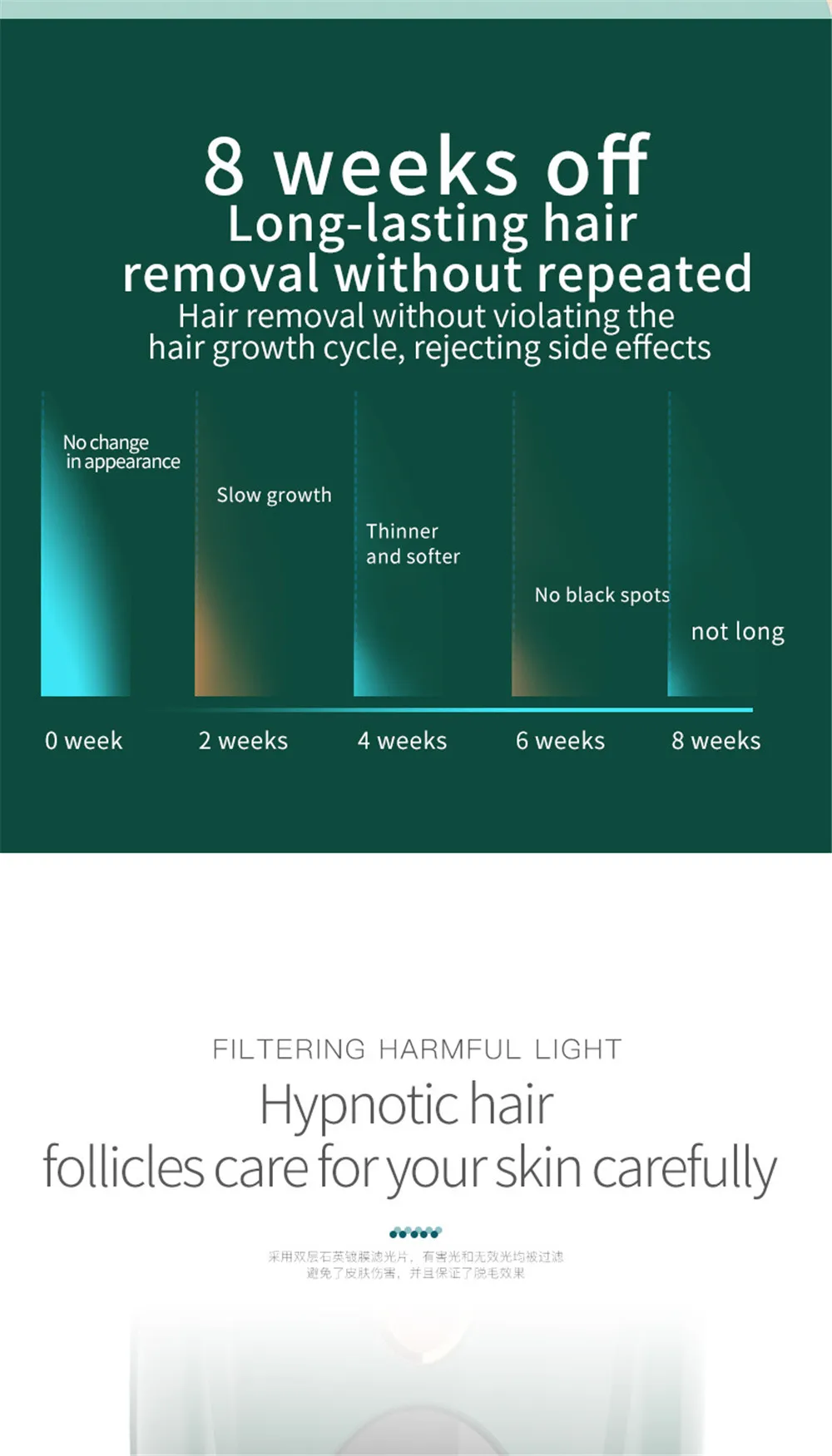 Особенности:【 Полностью автоматический пульт для удаления волос 】 Onemode дизайн: Полностью автоматический режим, более удобный для удаления волос, просто подключите устройство для удаления волос, включите переключатель, поместите головку лампы в контакт с кожей при 90 градусах, машина автоматически излучает и автоматически удаляет волосы.