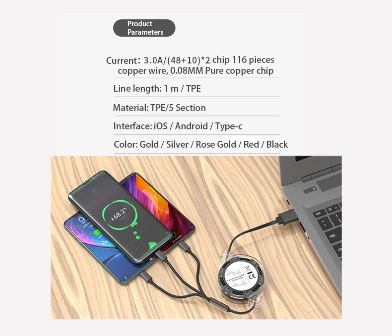 Ток: 3.0A / (48 + 10)* 2 чип, 116 шт. медный провод, 0,08 мм Чистый медный чипТекстура материала: TPE / 5 секцияДлина: 1 мИнтерфейс: для IP / Micro / Type-cЦвет: черный/красный/серебристый/золотистый/розовое золотоПосылка: Пожалуйста, обратите внимание!Этот продукт не имеет розничной коробки, но мы используем пластиковую розничную упаковкуУважаемый клиент:Этот кабель поддерживает только функцию зарядки, не поддерживает передачу данных, пожалуйста, обратите внимание, прежде чем покупать, спасибо!