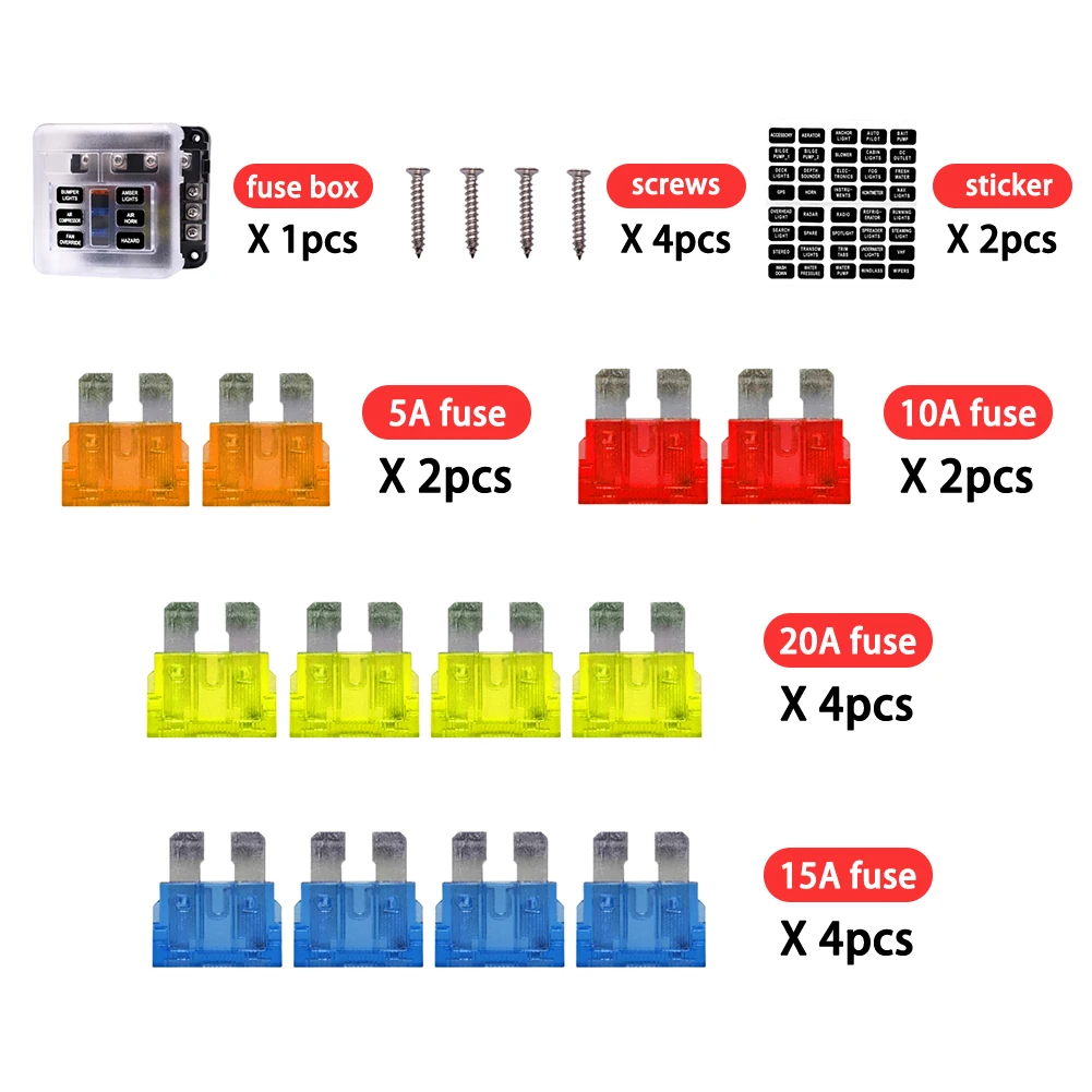 Package Includes:1 x Fuse Box 2 x Label Stickers 4 x Screws 2 x 5A Fuse