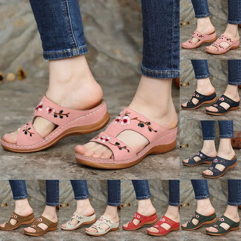 Женские шлепанцы с цветами, на платформе, разноцветные, этнические, на плоской подошве, удобные, повседневные, модные, летние