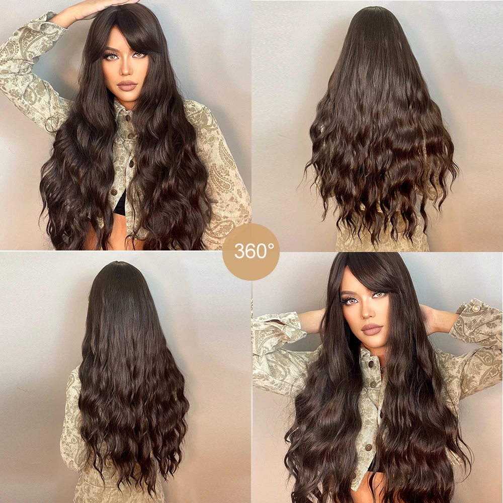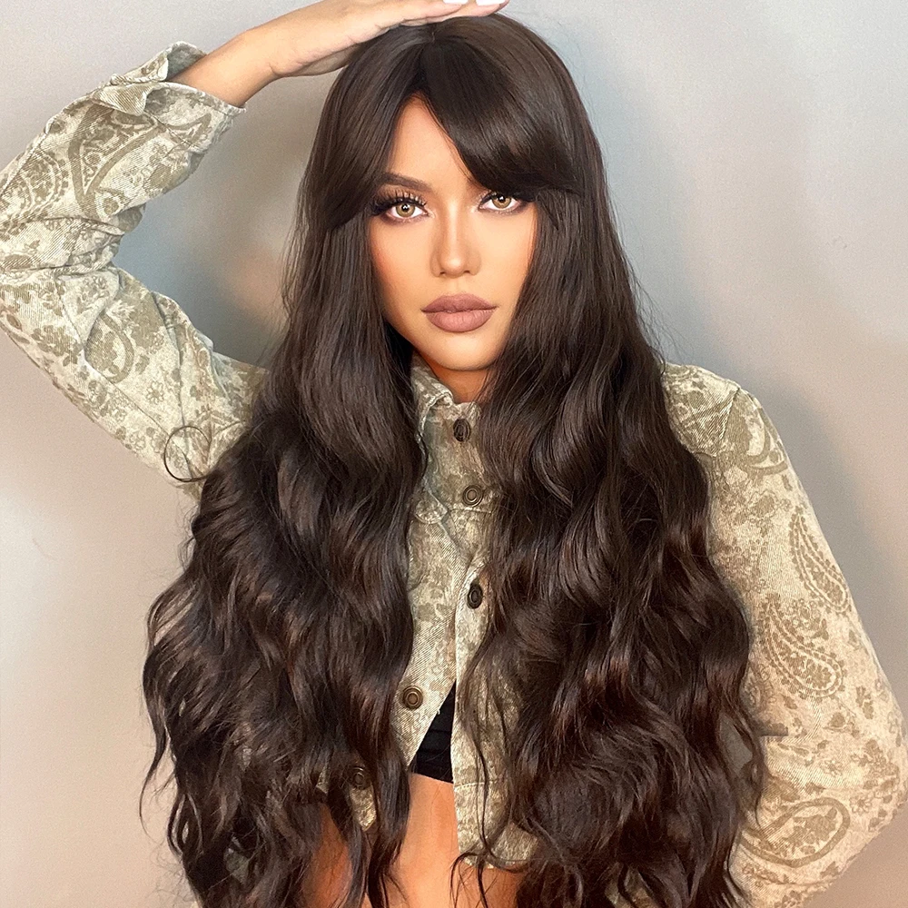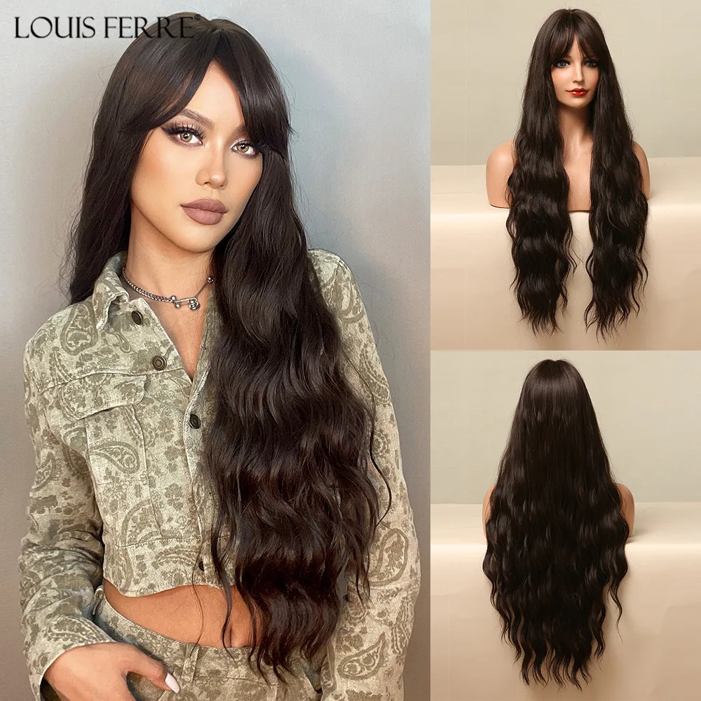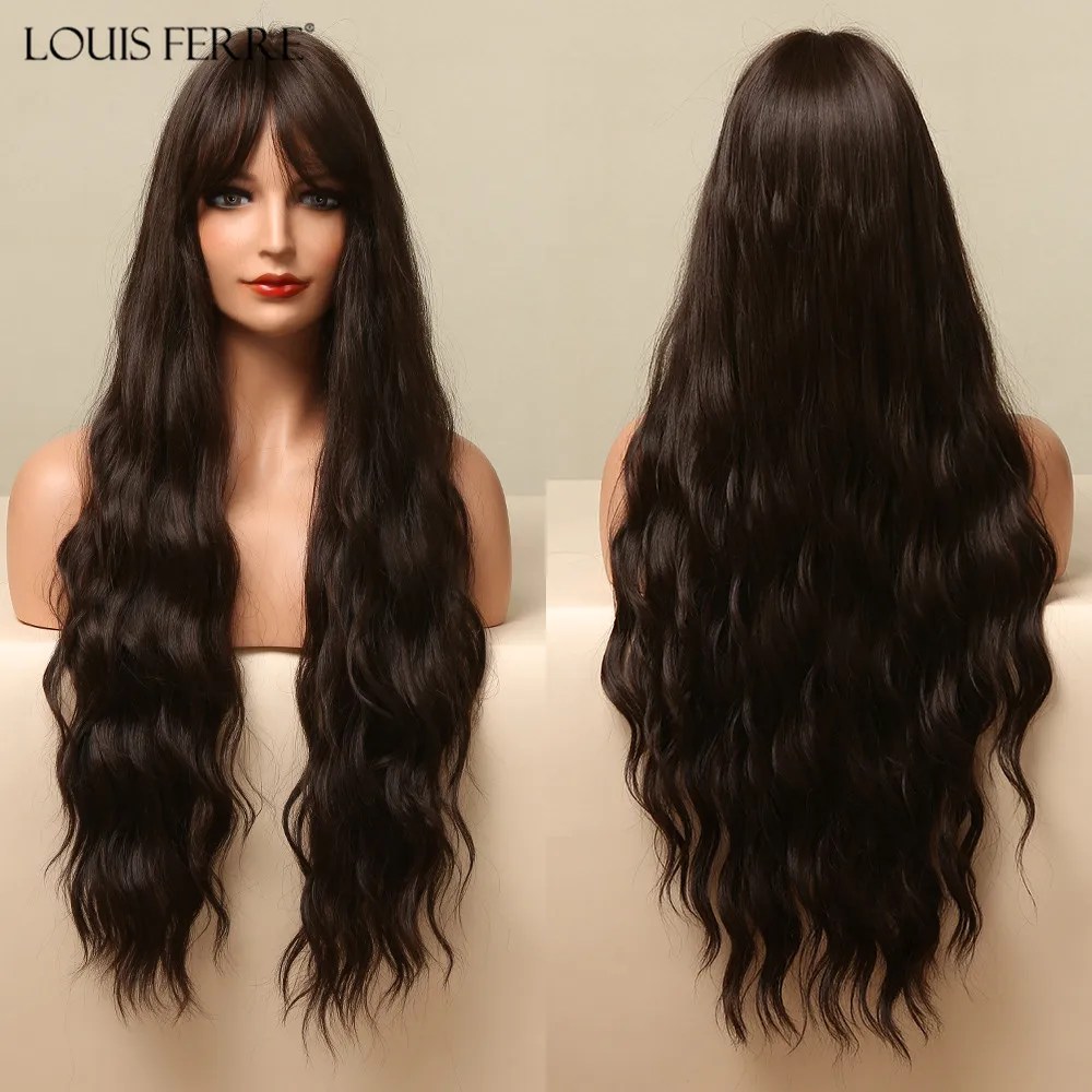 Парик LOUIS FERRE для женщин, Синтетические длинные вьющиеся волосы шоколадно-коричневого цвета, с челкой, термостойкий, для повседневвечерние, Косплея