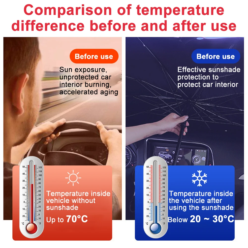 【Защитите себя и Car】Солнцезащитный козырек для автомобильного лобового стекла может эффективно защитить вас от солнечного света и обеспечить вам прохладную среду вождения, не допустить растрескивания сидений и приборной панели из-за воздействия солнца.