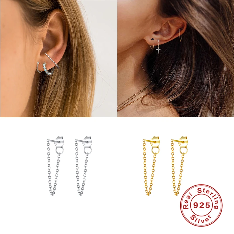 Женские серьги-гвоздики из стерлингового серебра 925 пробы с цепочк...