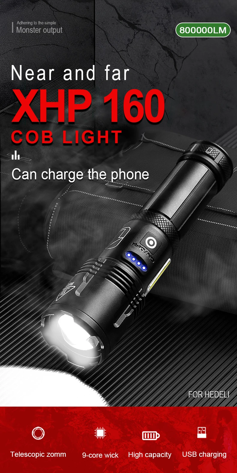 ♦Бренд: HEDELI♦Светодиодный светильник Модель: XHP160 + COB (новое обновление 9 ядер)♦Лампа/светодиодный срок службы: более 100000 часов♦Время освещения: аккумулятор 18650 4-6 часов; Аккумулятор 26650: 6-12 часов♦Диапазон: 800-1200 метров♦Режим масштабирования: телескопический зум♦Водонепроницаемость: IPX6♦Светящийся цвет: белый светильник XHP160, белый или красный светильник COB♦Дисплей питания: 100%-75%-50%-25%♦3 режима переключения: High-Low-SOS♦4 режима COB: белый светильник 100%-белый светильник 50%-красный светильник 100%-красный светильник SOS♦Перезаряжаемый: Micro USB, используется для компьютера USB, автомобиля USB, USB разъем для зарядки
