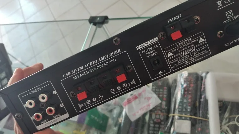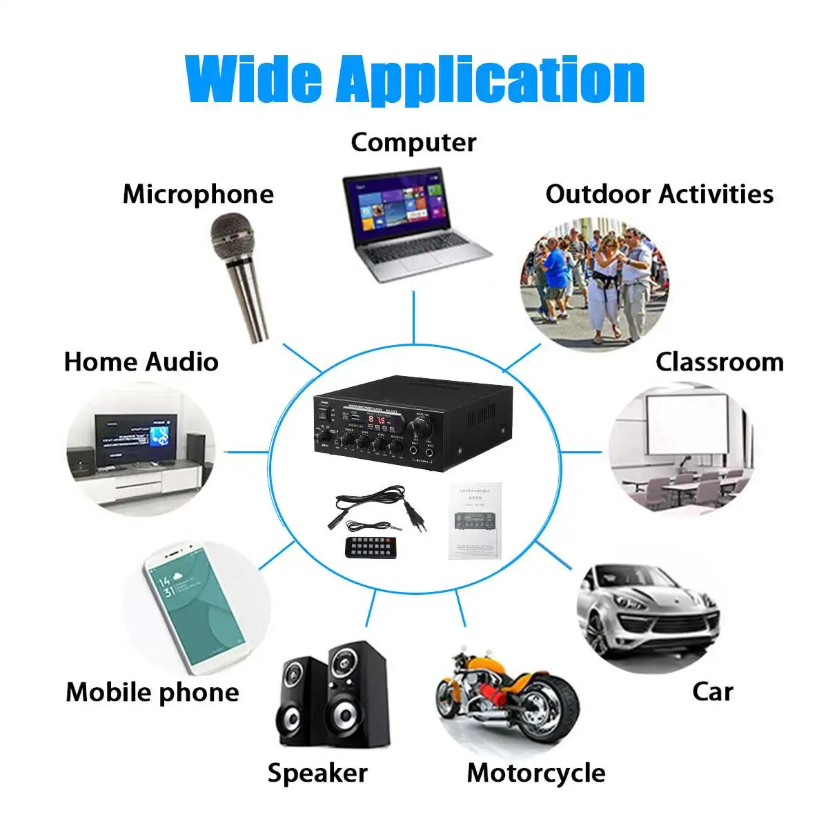 Особенности:-Цифровой mp3-плеер.-Интерфейс bluetooth для потоковой передачи музыки через мобильный телефон.-Слот USB / SD для воспроизведения MP3 с карты памяти или карты.-Поддержка 2 way вход для микрофона.-Поддерживает fm-стерео радио.-С высокими частотами, басами и регулятором громкости, очень прост в использовании.-Низкое Искажение обеспечивает более четкий, сильный и мощный звук.-2 канальный выход.-С функцией дистанционного управления.-Питание постоянного/переменного тока, подходит для домашнего использования.-Подходит для HiFi, систем домашнего кинотеатра и караоке.