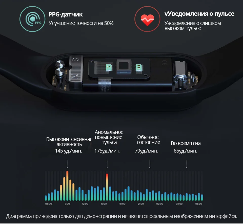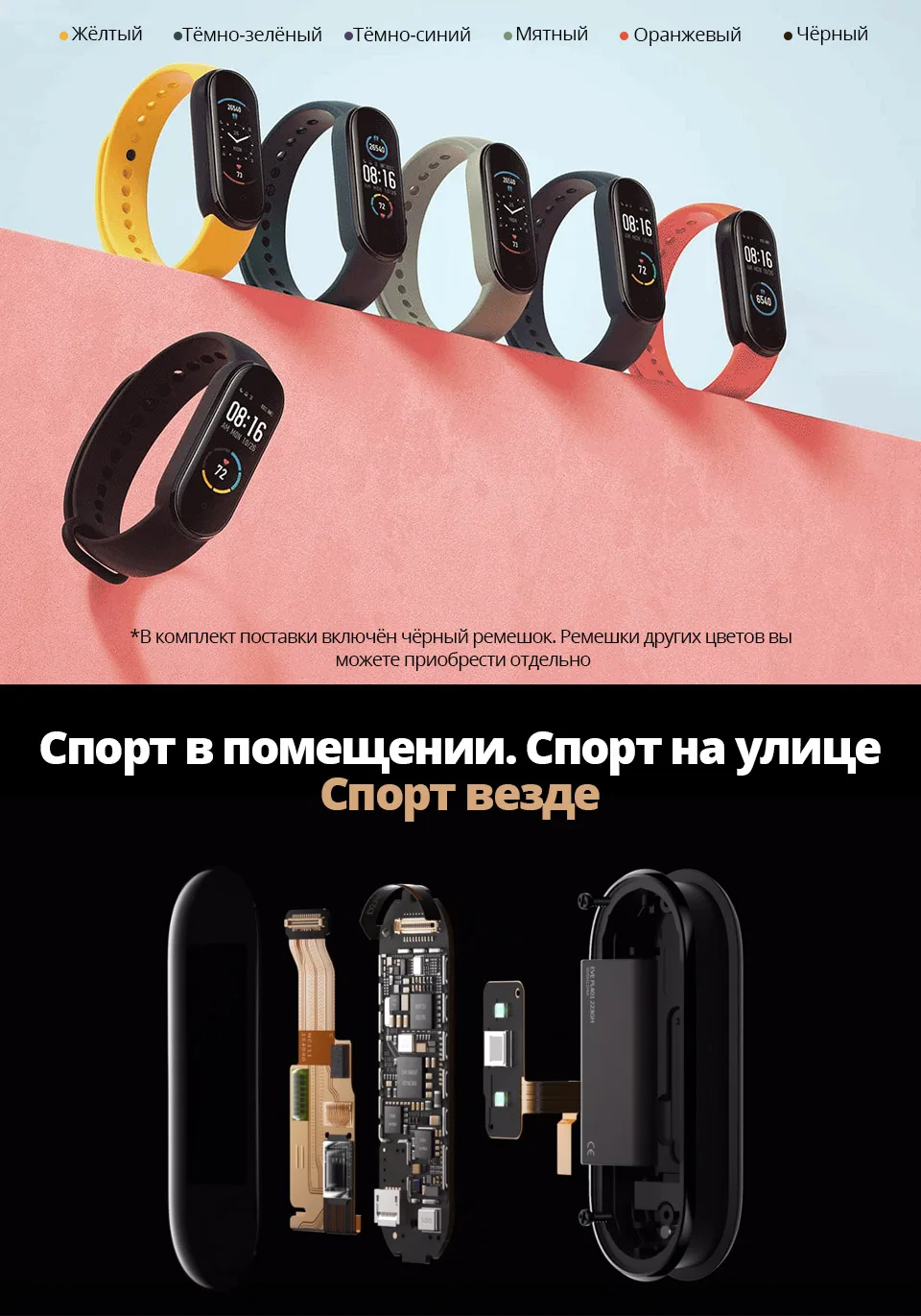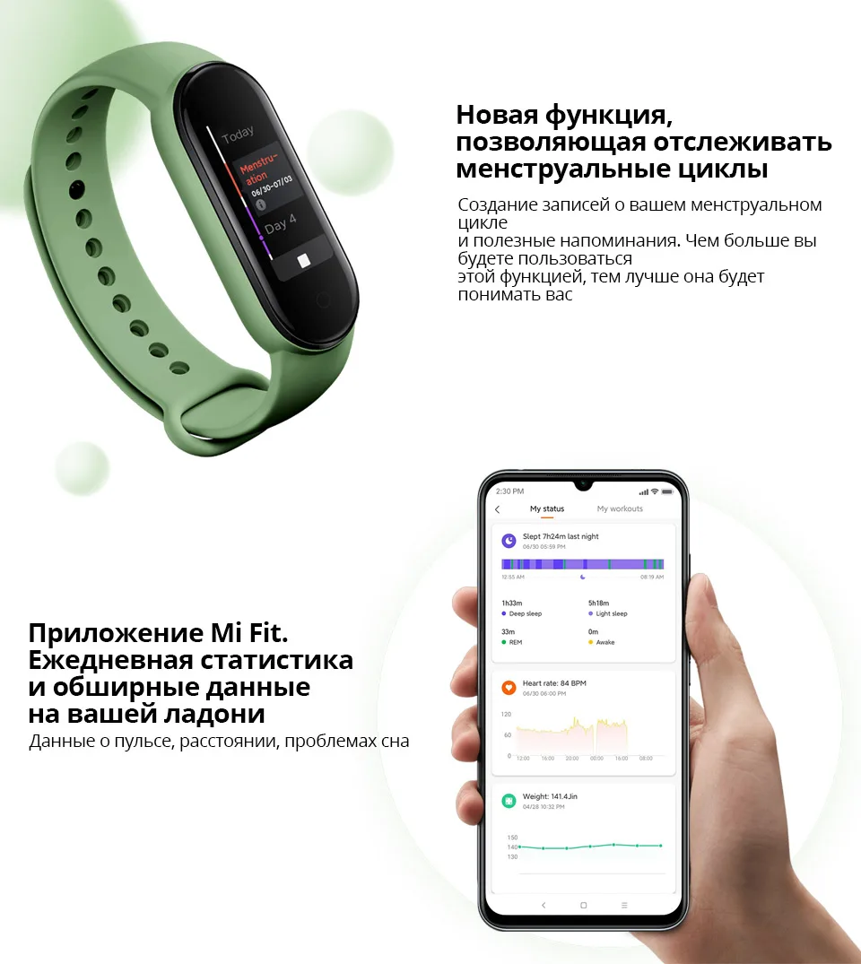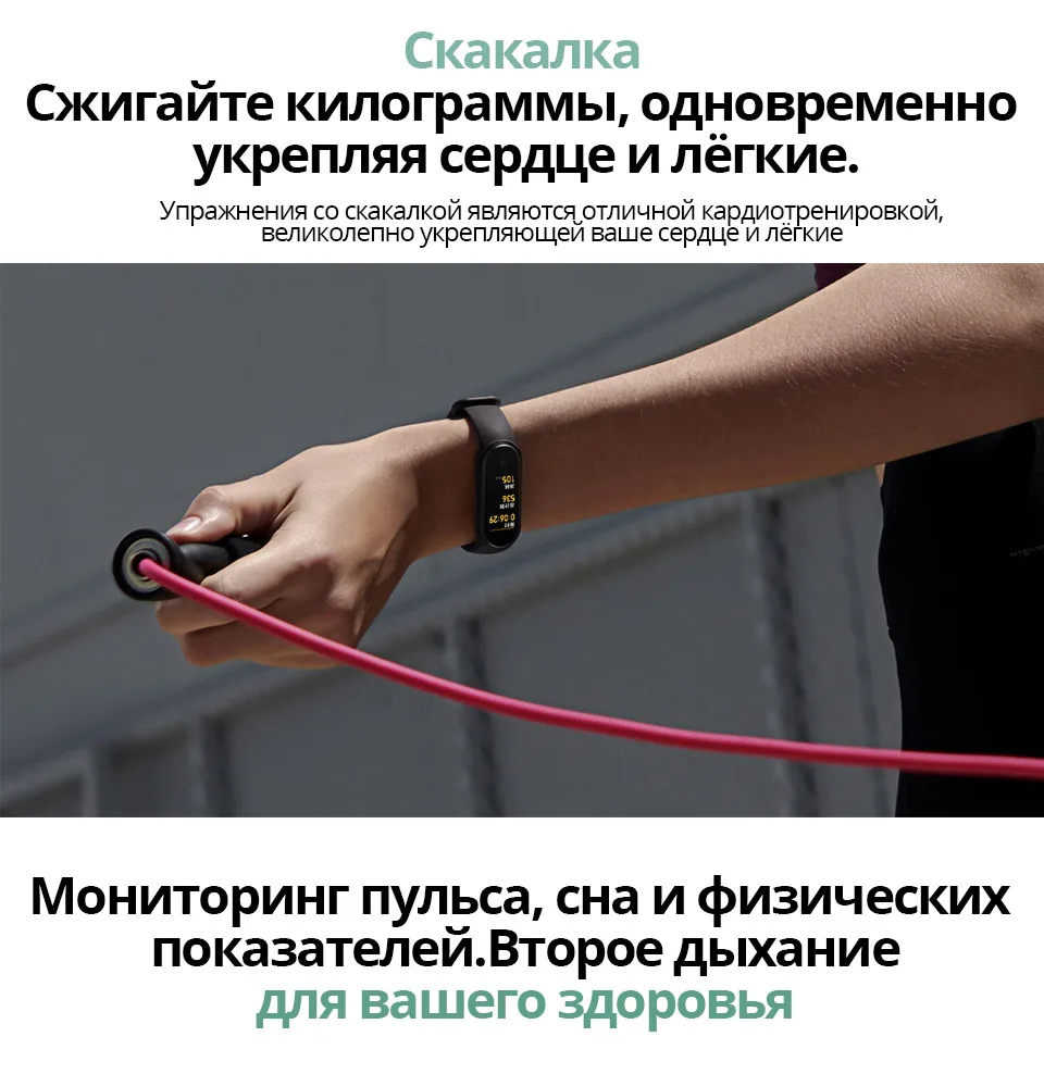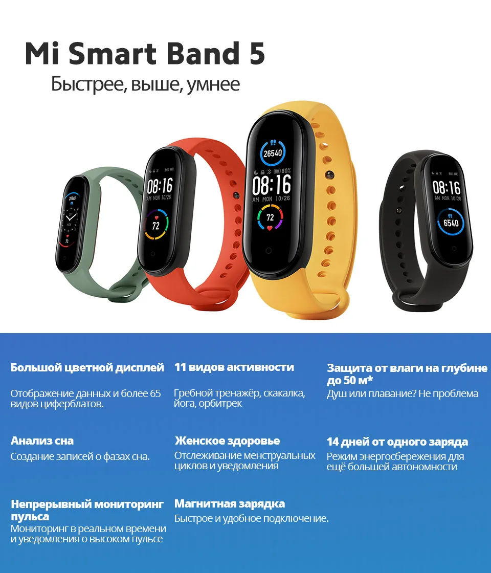 *Увеличенный прибл. на 20%* дисплей: площадь дисплея Mi Smart Band 5 была увеличена приблизительно на 20% в сравнении с браслетом Mi Smart Band 4. Данные предоставлены Huami Labs.*Пользовательские циферблаты: некоторые циферблаты поддерживают отображение настраиваемых элементов, обеспечивая быстрый доступ к вашим любимым и часто используемым функциям прямо с циферблата.*Увеличение точности измерения пульса на 50%: данные основываются на сравнении с браслетом Mi Smart Band 4, которое показало увеличение точности измерения пульса во время выполнения упражнений с нерегулярными движениями, таких как бег по пересеченной местности, альпинизм, хайкинг и других видов активности. Данные предоставлены Huami Labs.*Защита от влаги на глубине до 50 м: защита от влаги на основе стандарта GB/T 30106-2013 была испытана центром контроля качества China National Horological Quality Supervision and Testing Center. Номер отчёта: Mi Smart Band 5: QT2003010. Уровень защиты от влаги 5 атм (эквивалентно погружению на глубину до 50 метров) позволяет принимать душ и плавать, не снимая устройство. Однако при посещении сауны или во время дайвинга браслет необходимо снимать.*Персональный индекс жизнедеятельности: указывает на показатель PAI (Personal Activity Intelligence). Инновационный показатель, который рассчитывается путём конвертации данных о вашем пульсе и отражает уровень активности, необходимый для поддержания или улучшения состояния здоровья.*Условия испытания, подтверждающего 14-дневную автономность браслета Mi Smart Band 5 в стандартном режиме: полностью заряженный аккумулятор, автоматическое измерение пульса в течение 30 минут, функция «Подъём для активации» включена, для всех других настроек установлены значения по умолчанию, получение 100 уведомлений каждый день и их отображение на экране браслета, 2 будильника с вибрацией в течение 5 секунд каждый день, 100 активаций дисплея при помощи «Подъём для активации», синхронизация данных с приложением раз в день.*Условия испытания, подтверждающего 20-дневную автономность браслета Mi Smart Band 5 в энергосберегающем режиме: полностью заряженный аккумулятор, автоматическое измерение пульса отключено, функция «Анализ сна» отключена, функция «Подъём для активации» отключена, получение 100 уведомлений каждый день и их отображение на экране браслета, 2 будильника с вибрацией в течение 5 секунд каждый день, 10 активаций дисплея для просмотра времени при помощи кнопки на браслете, синхронизация данных с приложением раз в день.*Все данные об автономности браслета предоставлены Huami Labs. На автономность могут влиять различные факторы, такие как используемые настройки, способы использования устройства, условия окружающей среды и т. д. Поэтому время работы устройства может отличаться от данных, полученных в лабораторных условиях.*Все изображения используются исключительно для демонстрации функциональности устройства и не полностью отражают характеристики фактического устройства.