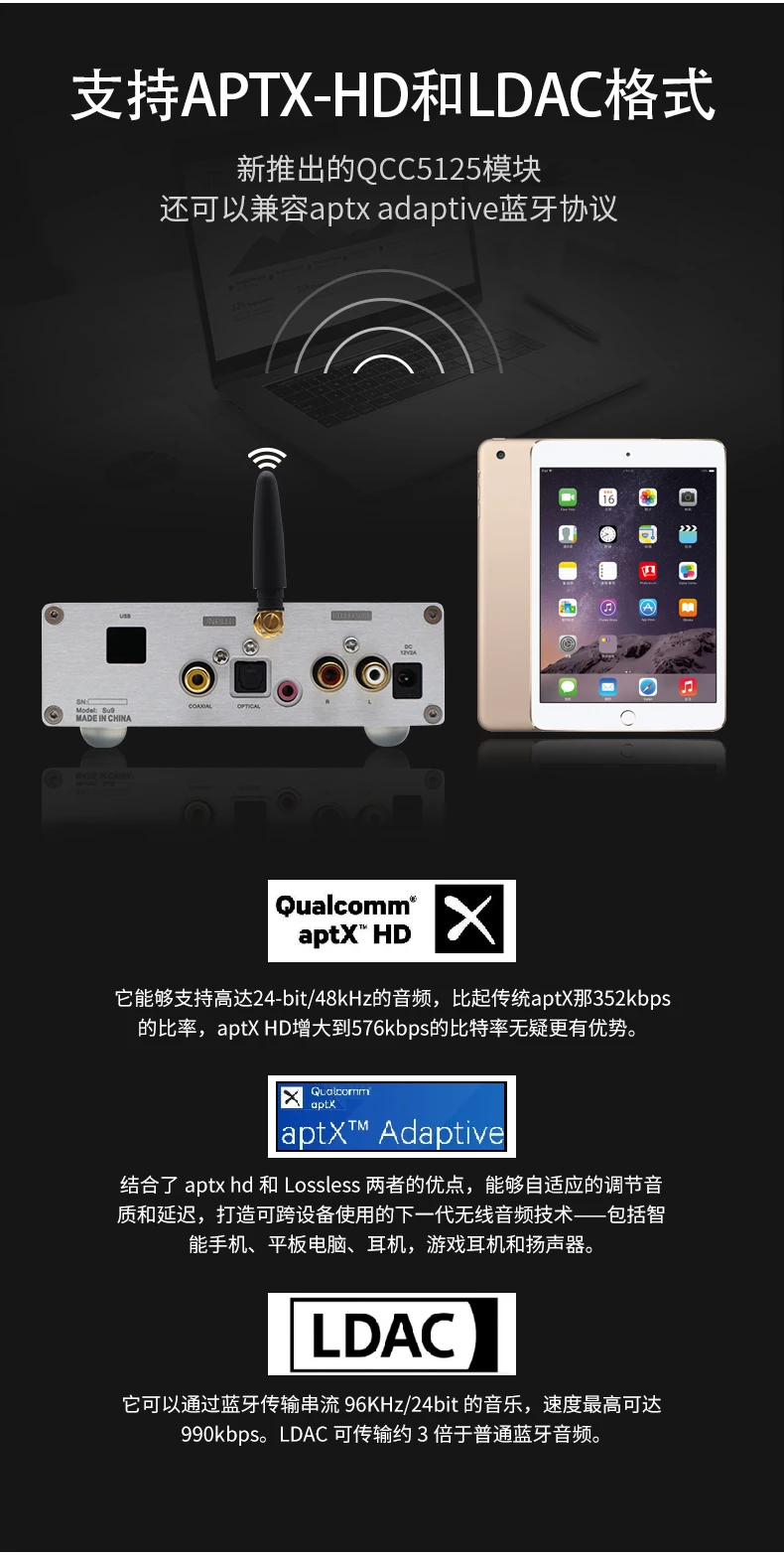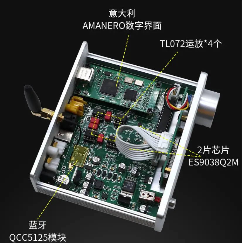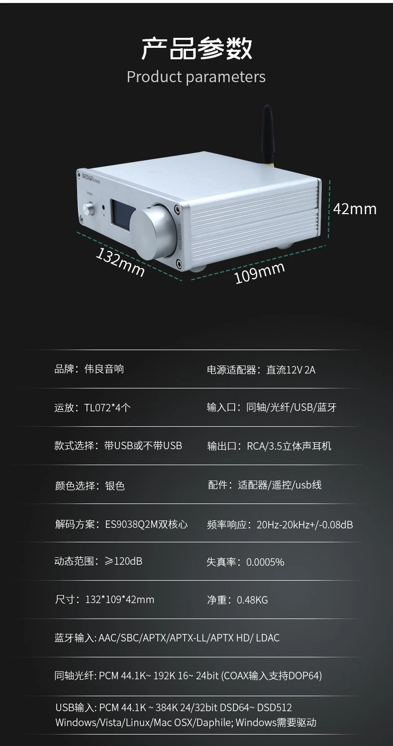 Обратите внимание, что в этом продукте используются две чипы ES9038Q2M, которые отличаются от общих чипов ES9038Q2M. Эффективность анализа, плотность и разделение будут значительно улучшены. Конечно, стоимость также дороже. Bluetooth также был обновлен до новейшего bluetooth-решения Qualcomm QCC5125, точность лучше, чем CSR8675, поддержка APTX-HD! + LDACС XMOS или прямой гравировкой, итальянское цифровое декодирование Amanero, непосредственно жесткое декодирование DSD64-DSD512! Описание аксессуаров для машины: 1 адаптер 12V2A, 1 пульт дистанционного управления, 1 USB (только для версии USB)Технические характеристики машины: 130*42*108 без клеммной ручкиСсылка на Драйв: https://amanero.com/drivers.htmРуководство пользователя: ссылка: https://pan.baidu.com/s/1qYC_I1ta5UWAkeVieTN99QКод извлечения: awuq "Руководство по установке драйвера и установке подножек"Ссылка: https://pan.baidu.com/s/1uUn-AAqjN9kWxfEEx-_zzwКод извлечения: 2333 ЦАП подходит для дома и автомобиля