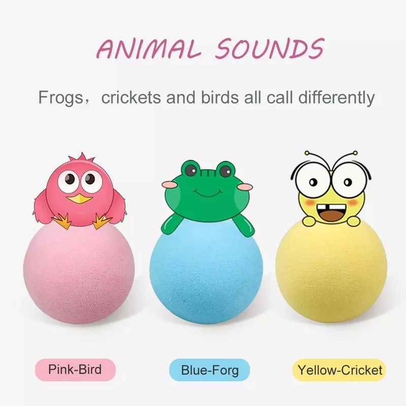 Имитируйте реальные звуки трех различных животных, чтобы привлечь внимание кошек и стимулировать охоту на кошек. Звуки шариков разных цветов отличаются, звук сине-лягушки, звук желтого-крикет, звук розово-птицы.