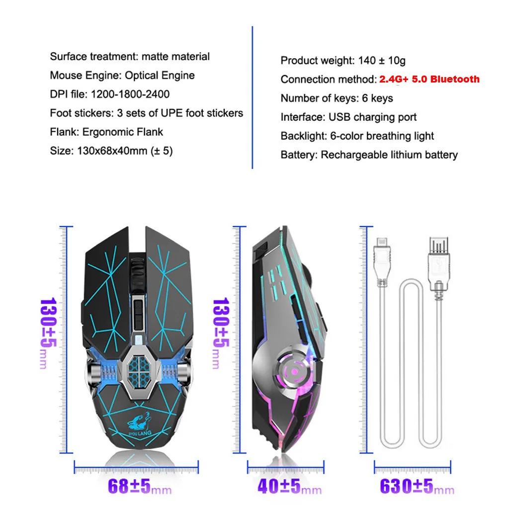 Двойной режим Подключение, беспроводная передача 2,4G и передача Bluetooth 5,0. Бесшумный, чувствительный И устойчивы, обеспечивая точный щелчок отзывы, уменьшая шум как Как можно больше. Хорошая совместимость, Совместим с различными настольными компьютерами, ноутбуками и смарт-телевизорами, которые Поддержка USB периферийных устройств. Поддержка Micro-USB Порт для зарядки, может быть полностью заряжен в 2,5 часов, а также поддерживает зарядку одновременно Использование, нет необходимости покупать дополнительные батареи. Описание Тип изделия: беспроводной Мышь Обработка поверхности: Матовый Двигатель мыши: Оптический Двигатель Подключение: 2,4 ГГц /Bluetooth 5,0 DPI файл: 1200-1800-2400 Количество кнопок: 6 кнопок Наклейки для ног: 3 Наборы наклеек для ног UPE Интерфейс: USB Зарядка Фланец: эргономичный Фланец Подсветка: 6 цветов Дыхательный светильник Мощность: 500 мАч Литиевые батареи (в комплекте) Продолжительность Зарядка: 2-3 часа Ультра-довольно и Низкое трение Размер: 130x68 x 40 мм/5.12x2.68x1.57inУпаковочный лист: