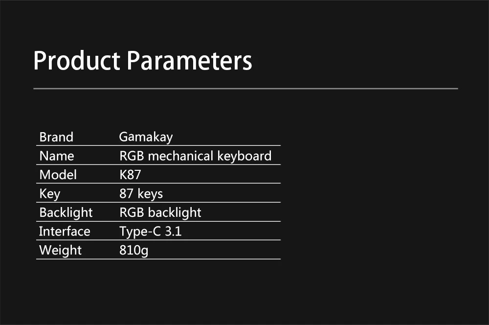 Характеристики:Название: Механическая игровая клавиатураКлюч: 87 клавишПодсветка: RGB подсветкаИнтерфейс: Type-C 3,1Вес: 810 г