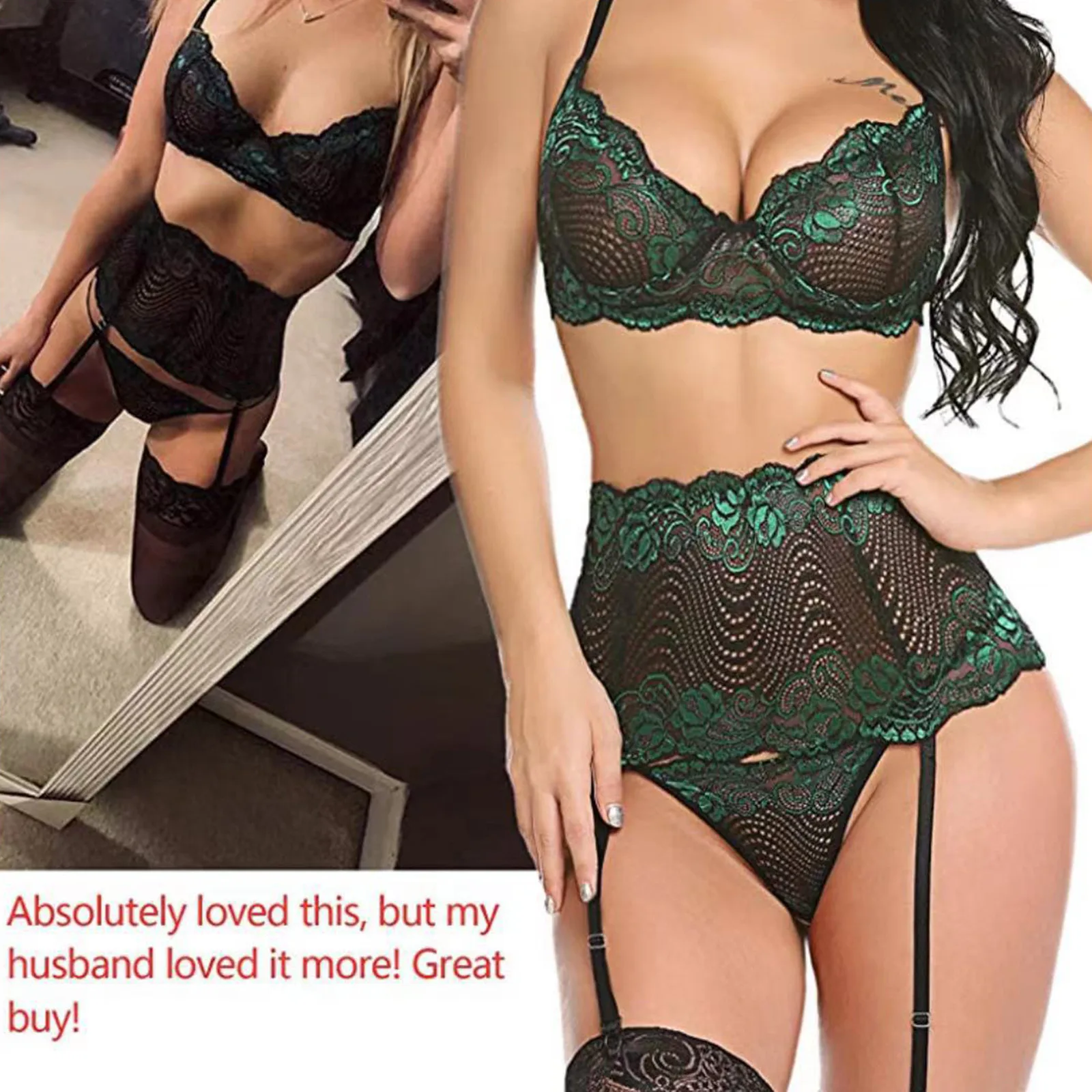 Сексуальное женское нижнее белье, соблазнительный прозрачный бюстгальтер, стринги, подвязки, пояс, комплект нижнего белья из 3 предметов, кружевное нижнее белье, чувственное женское белье