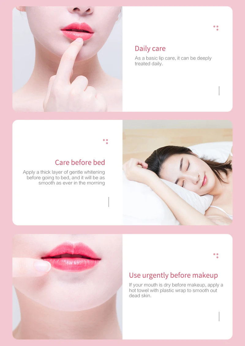 С натуральными ингредиентами, витамин С-богатая ягода смешанный комплекс может устранить сухую, чешуйчатую омертвевшую кожу на губах в ночное время, тем самым делая губы гладкими на следующее утро.