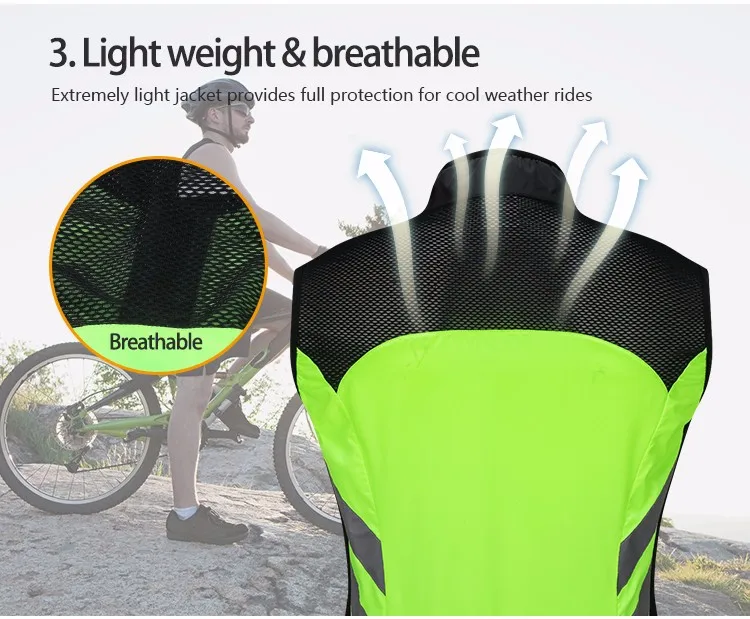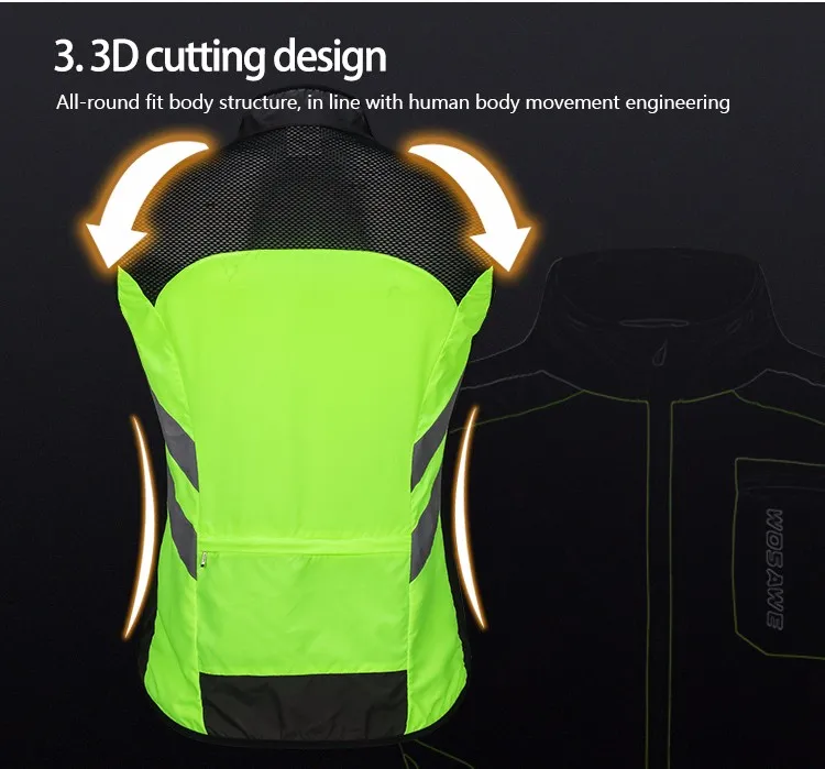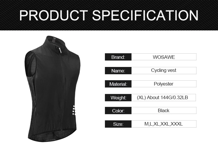 Легкая техническая ткань, ветрозащитная и водоотталкивающая Воротник-стойка ветрозащитный Дизайн без рукавов поможет вам оставаться прохладным Длинная молния Эластичная лента на рукавах и низкий подол 2 светоотражающие линии обеспечивают безопасность ночной езды Длинная спина 1 карман сзади на молнии Светоотражающий логотип WOSAWEОписание товара Название: велосипедный жилет без рукавов Бренд: WOSAWE® Модель: BL205 Пол: унисекс Цвет: черный, оранжевый, зеленый Размер: M L XL XXL XXXL Вес: 145 г Материал: полиэстер Применение: езда на велосипеде, рыбалка, бег, кемпинг и пеший Туризм Спорт на открытом воздухе Посылка: полиэтиленовый пакет Прикреплено: бирка