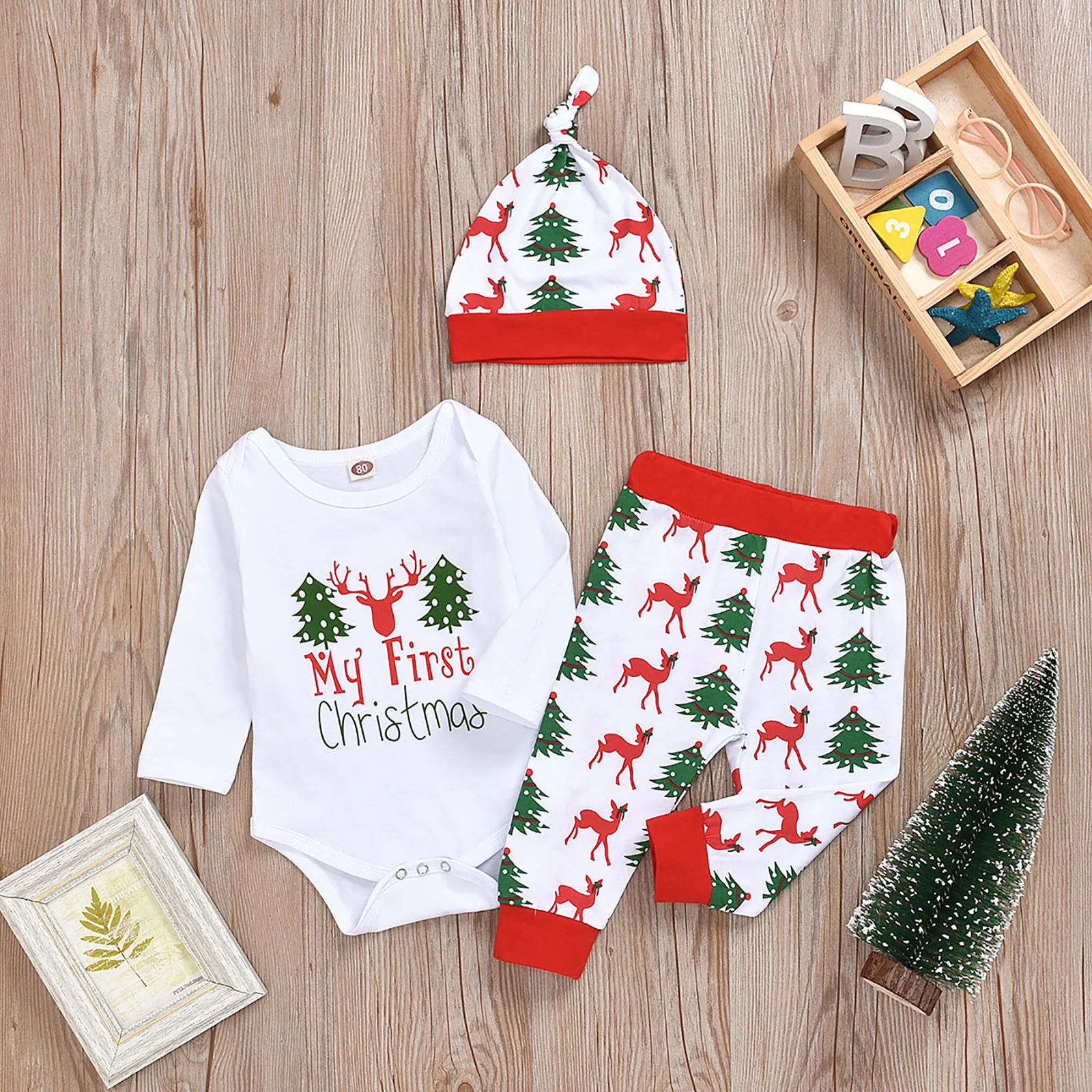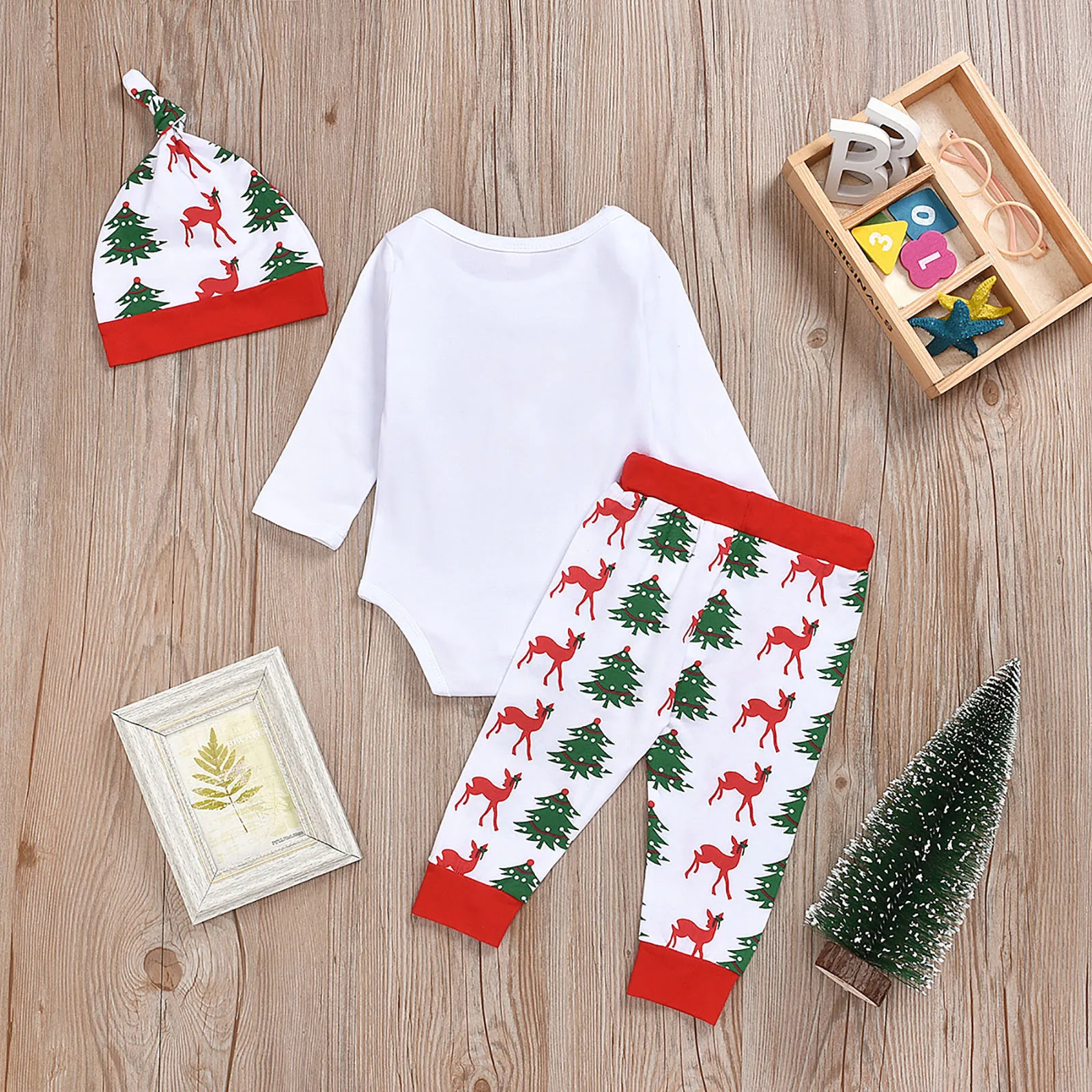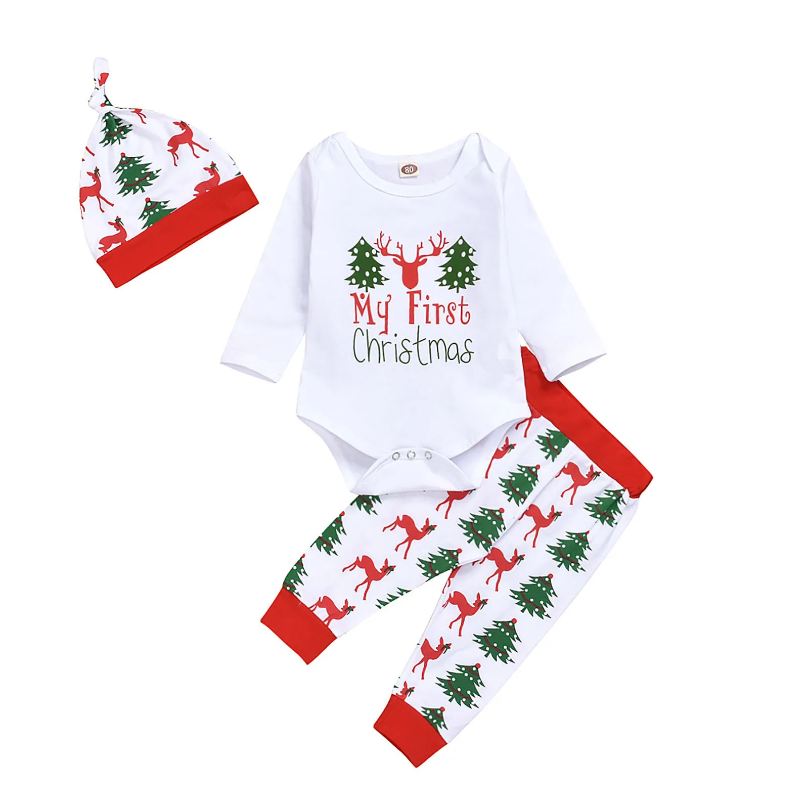 Рождественская Одежда для новорожденных мальчиков и девочек комплект из 3 предметов: комбинезон + штаны + шапочка