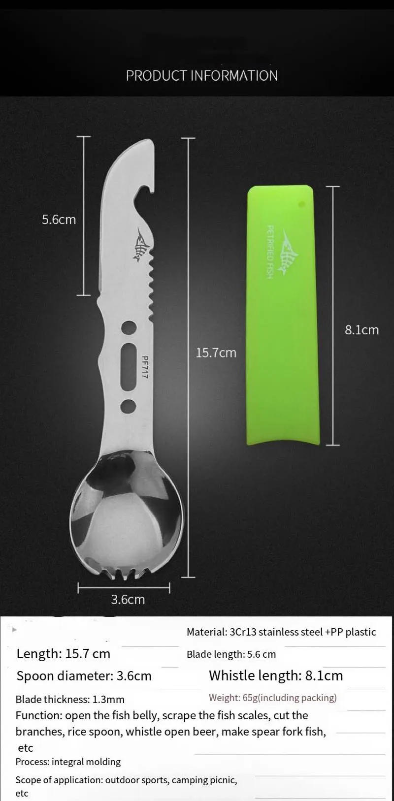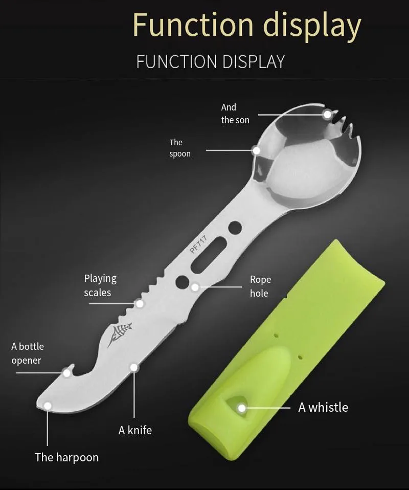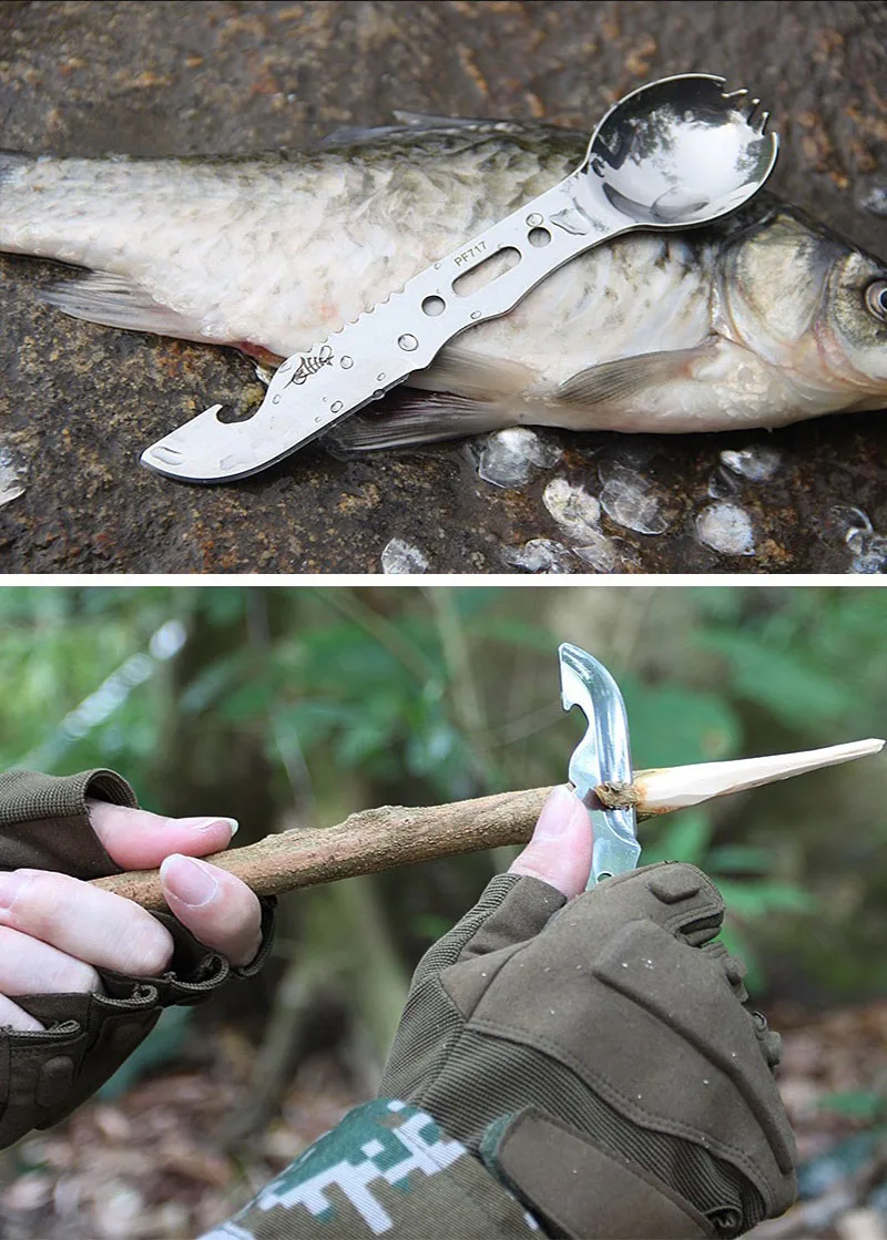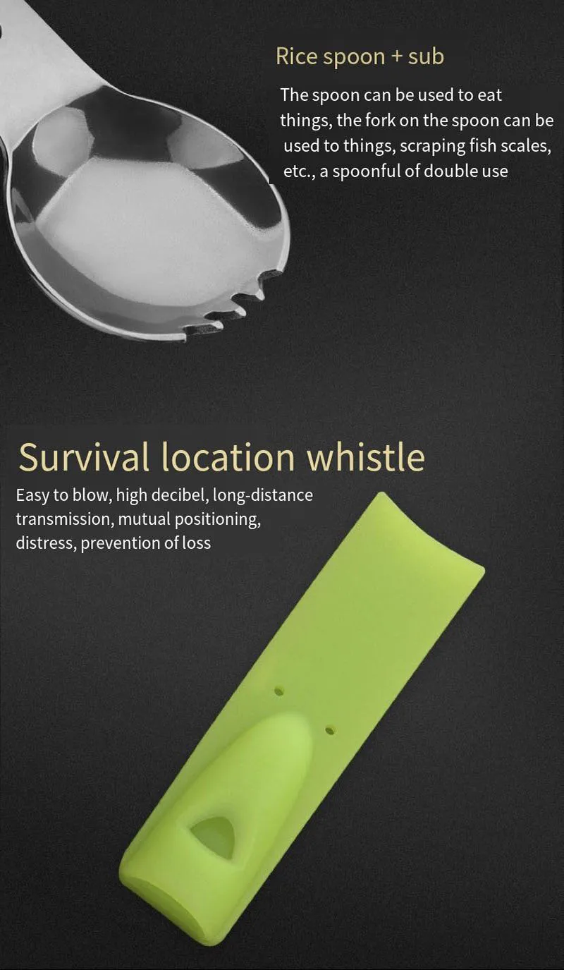 Многофункциональная спортивная посуда со свистком, портативная походная вилка для пикника, ложка для кухни, открывалка для бутылок, столовые приборы из нержавеющей стали, инструменты для выживанияСпецификация:Материал: нержавеющая стальЦвет: черный, оранжевый, хаки, зеленыйРазмеры: Длина 16 см/ширина ложки 3,5 см/1.38inВес: 42 гФункция: ложка, вилка, скребок для рыбьей чешуи, открывалка для бутылок, нож для кожурыУпаковка: OPP мешок + коробкаПримечание:1. Из-за различных настроек монитора и светильник эффект, фактический цвет элемента может быть s светильник ly отличается от цвета, представленного на снимках. Спасибо!2. Возможны отклонения в 1-3 см вследствие измерений вручную.
