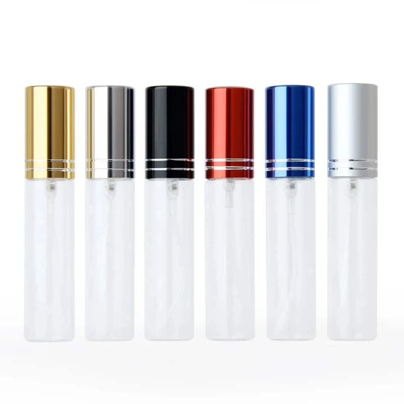 20 шт./лот, 5 мл, 10 мл, 15 мл, прозрачная стеклянная бутылка для распылителя, многоразовая цветная алюминиевая крышка, спрей, флакон для духов, контейнер для путешествий